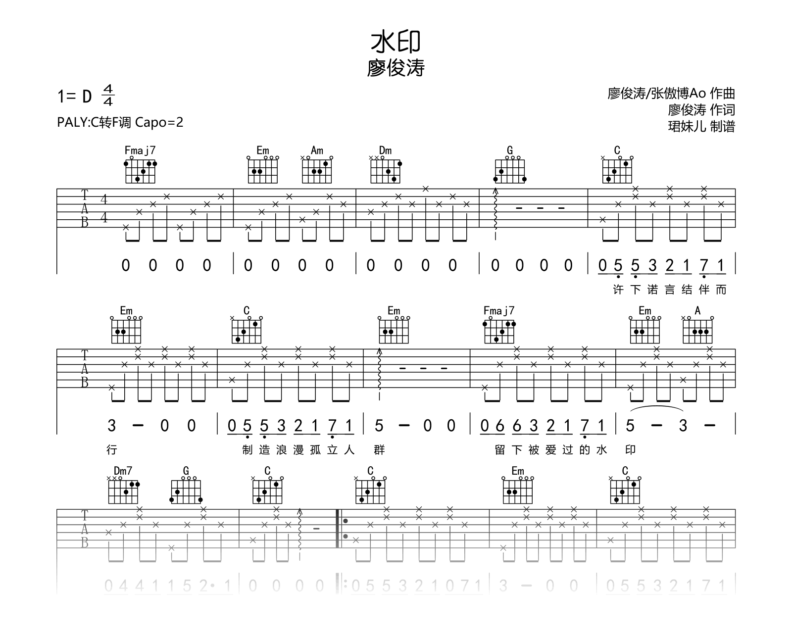 水印吉他谱 - 廖俊涛 - C调吉他弹唱谱