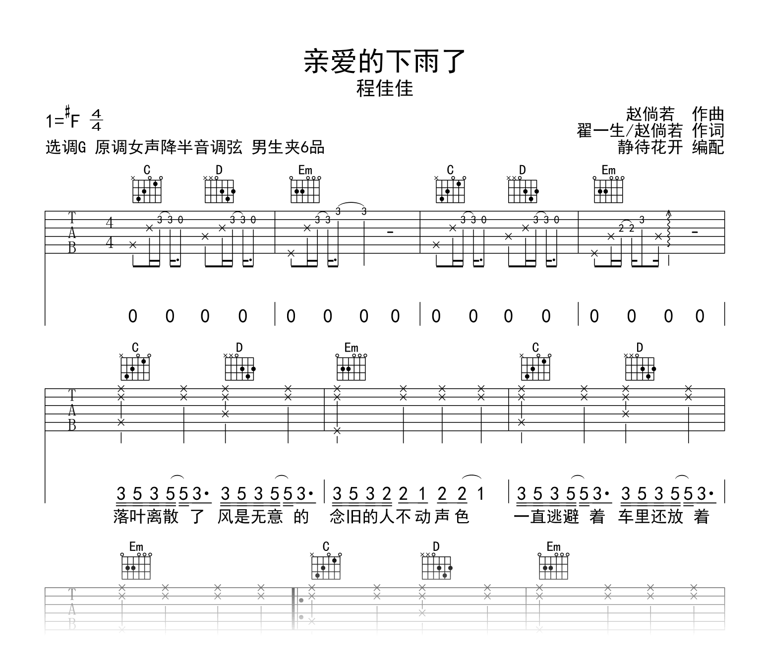 亲爱的下雨了吉他谱 - 程佳佳 - C调吉他弹唱谱