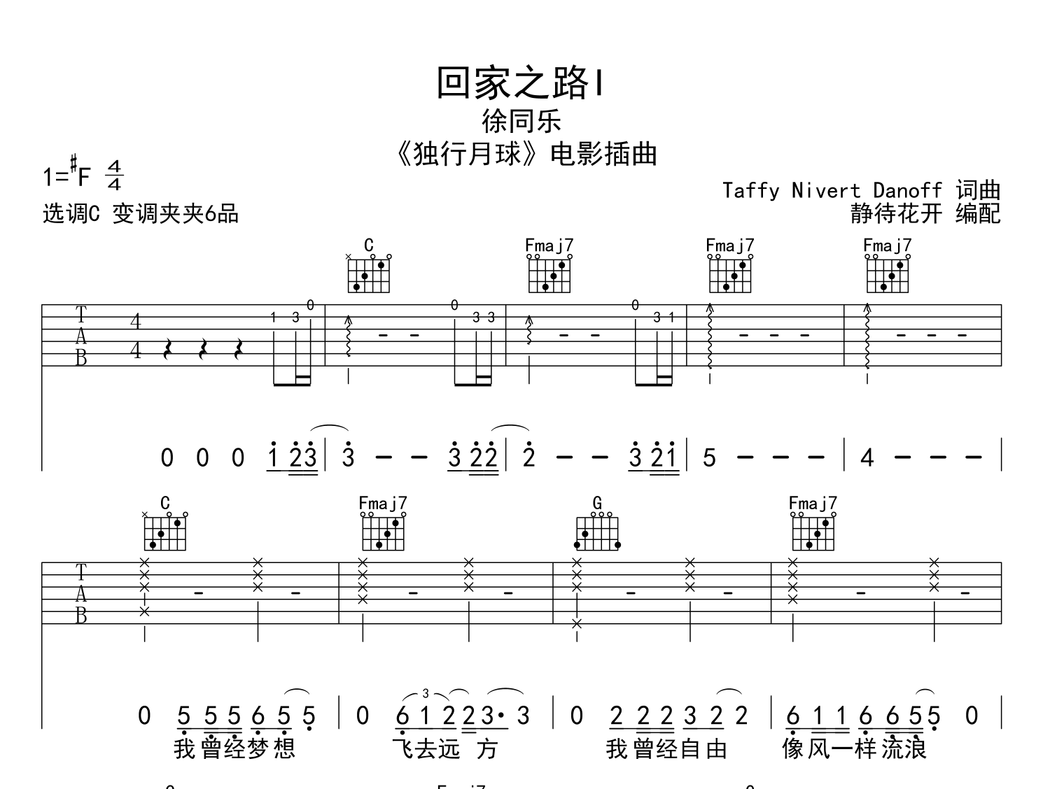 曲谱介绍: 回家之路I吉他谱,徐乐同演唱的《独行月球》电影插曲,《回家之路Ⅰ》吉他弹唱谱,来自@静待花开编配扒谱制作,本吉他谱采用C调和弦指法编配,推荐变调夹夹第6品演奏,原调#F调,也可以根据个人嗓音条件灵活选择变调夹位置,演奏的速度控制在每分钟70拍左右,演奏难度简单。