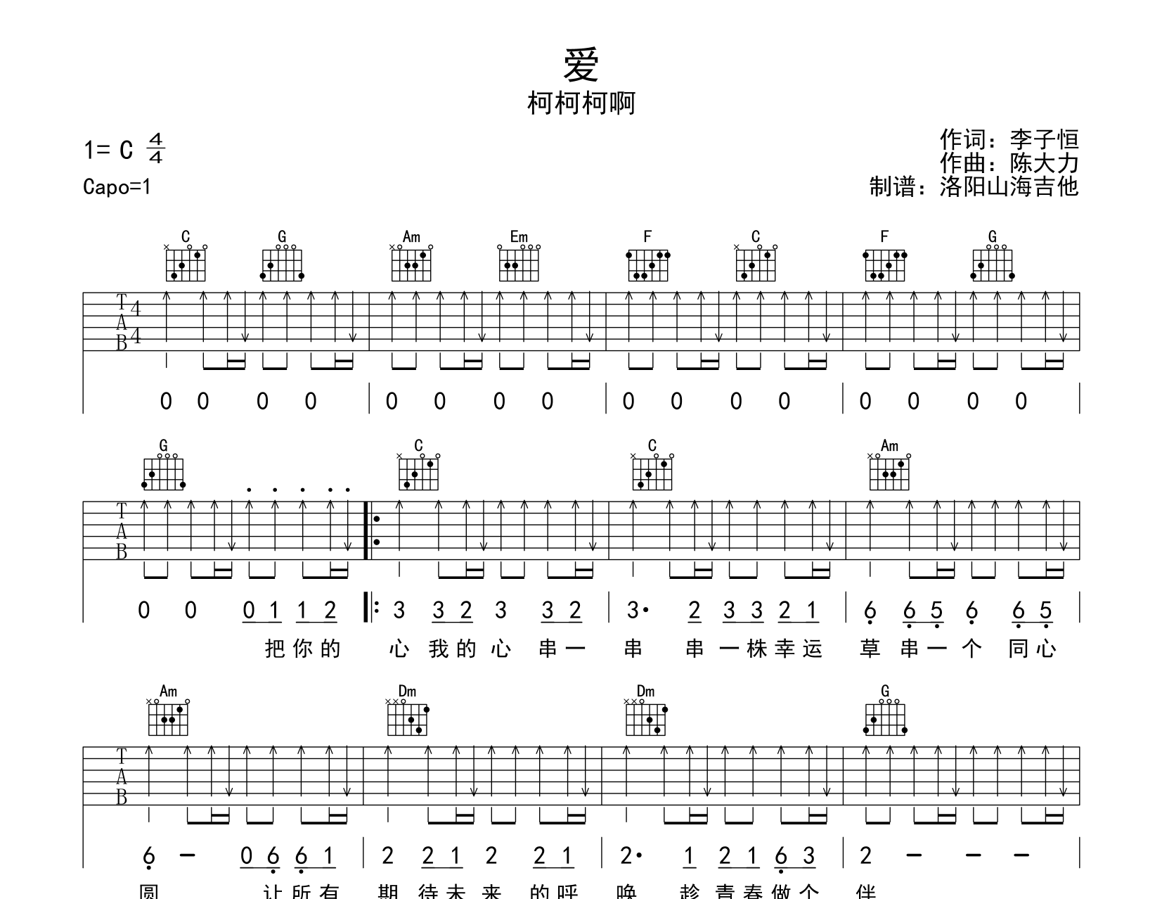 曲谱介绍: 《爱》吉他谱,柯柯柯啊翻唱的小虎队歌曲,《爱》吉他弹唱谱,选用C调指法,原调#C,CAPO夹1品弹唱原调,节奏4/4拍,全曲用扫弦编配,难度较简单,由洛阳山海吉他编配制谱,共2张高清图片谱。