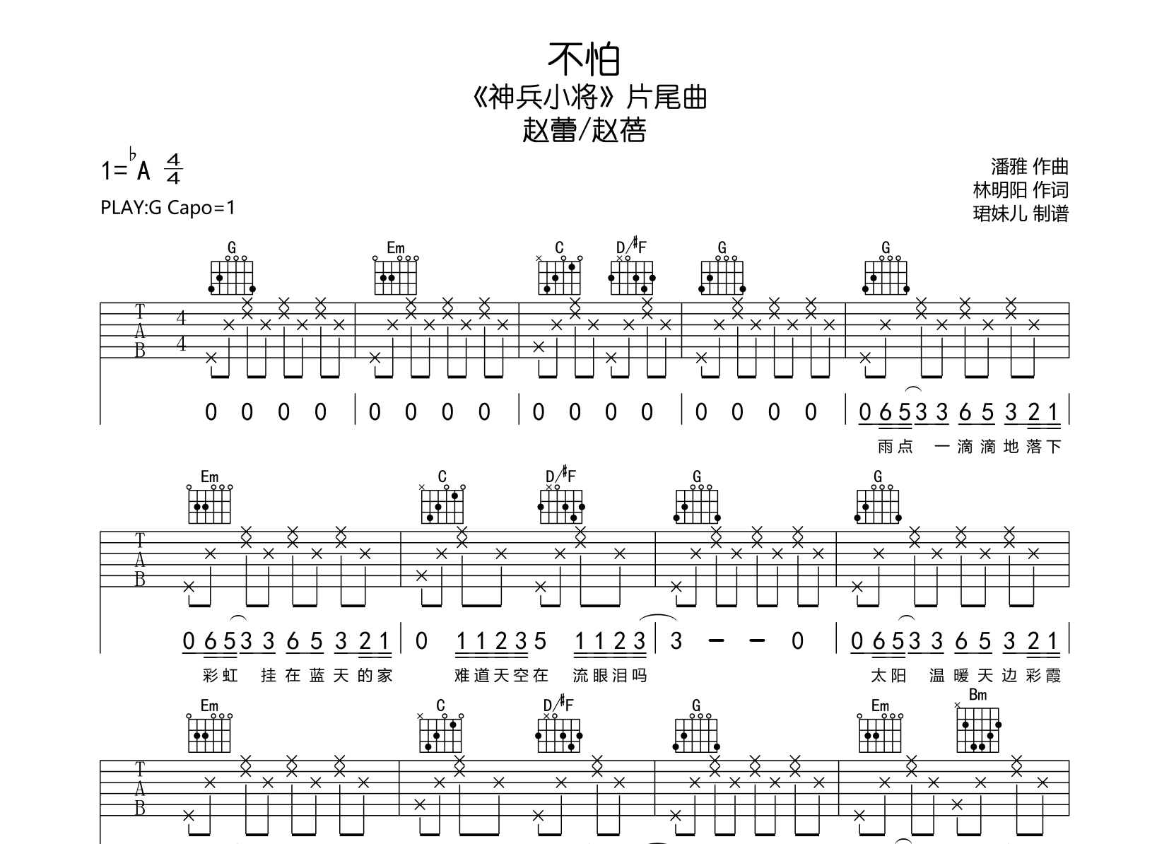 曲谱介绍: 不怕吉他谱,赵蕾/赵蓓演唱的《神兵小将》片尾曲,《不怕》吉他弹出破,本谱采用G调指法编配,弹唱建议变调夹1品,速度85BPM,节奏4/4拍,难度较简单,易上手,本谱由珺妹儿制谱,共2张高清图片谱例。