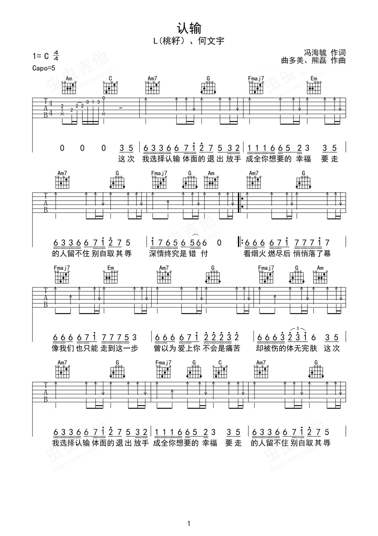 曲谱介绍: 认输吉他谱,L(桃籽)/何文宇演唱的网络歌曲,《认输》吉他弹唱谱,选用C调指法,原调F调,CAPO夹5品弹唱原调,共2张高清图片谱,由单身狗制谱分享。