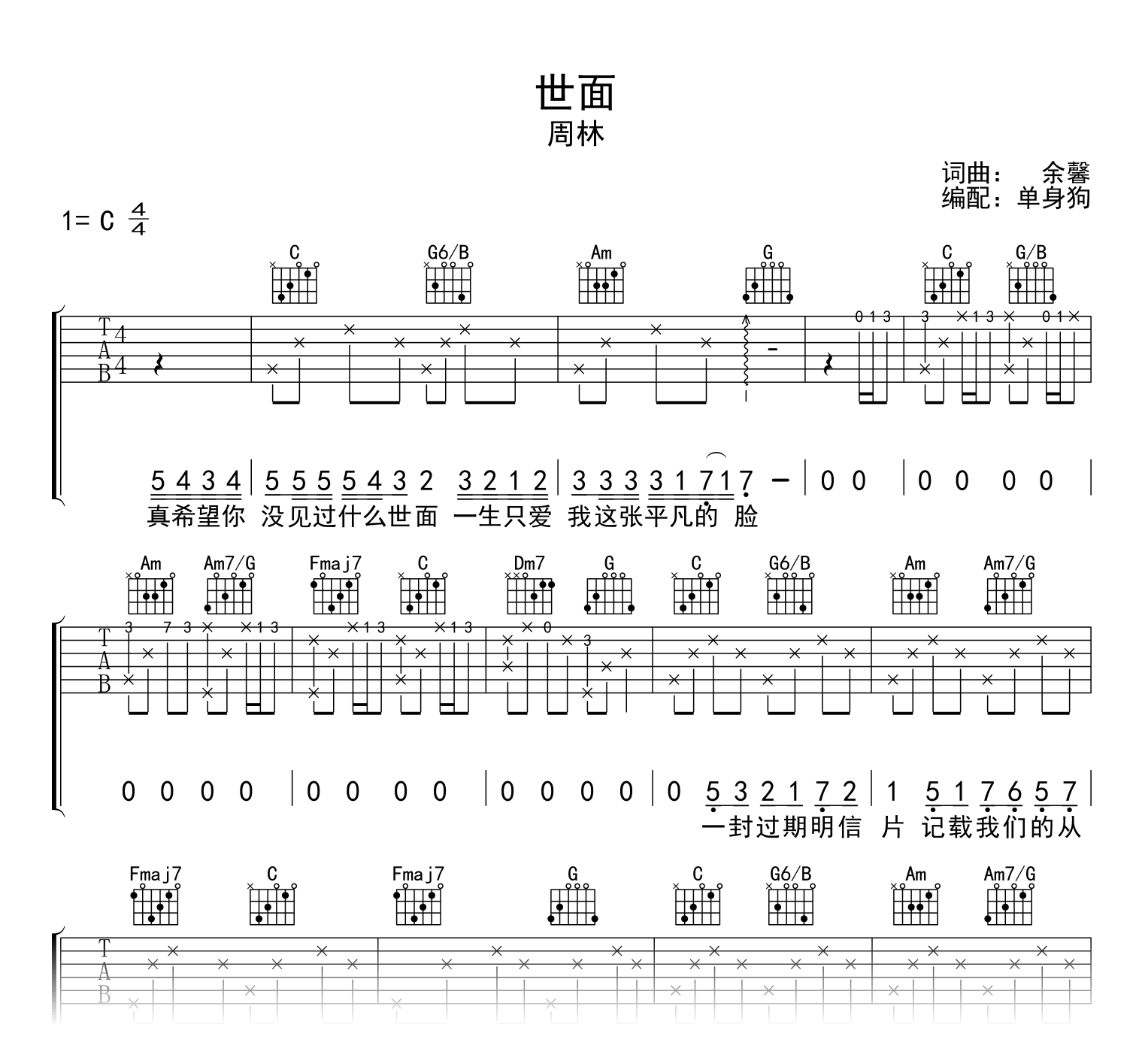 曲谱介绍: 世面吉他谱,周林演唱的一首网络热门小情歌,多想时间能够定格在那个夏天,红着脸第一次见面。《世面》吉他弹唱谱,选用C调指法编配,共三张高清图片六线谱。