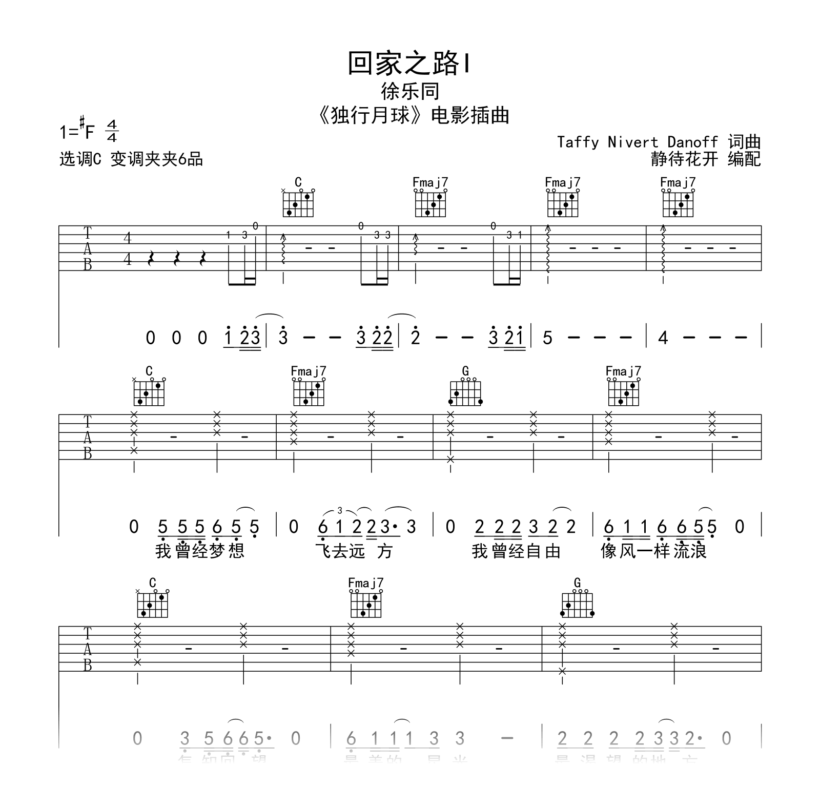 曲谱介绍: 回家之路I吉他谱,徐乐同献唱电影《独立月球》插曲,《回家之路I》吉他弹唱谱,原调#F调,选用C调和弦指法编配,变调夹夹第六品,速度在每分钟70拍左右,演奏难度简单。 原曲改编自《Take Me Home, Country Roads》,在朴素又动人的曲调中,独孤月在浩瀚的宇宙中,一步一步靠近着梦中的蓝色星球,家触手可及,朝思暮想的人似乎近在咫尺。