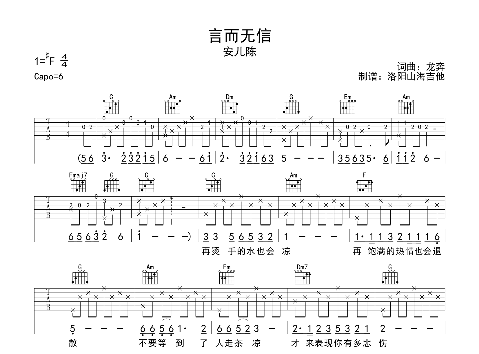 曲谱介绍: 《言而无信》吉他谱,安儿陈演唱的歌曲,《言而无信》吉他弹唱谱,选用C调指法,原调#F,节奏4/4拍,含前奏按原版编配,难度初级较简单,由洛阳山海吉他编配制谱,共2张高清图片谱。
