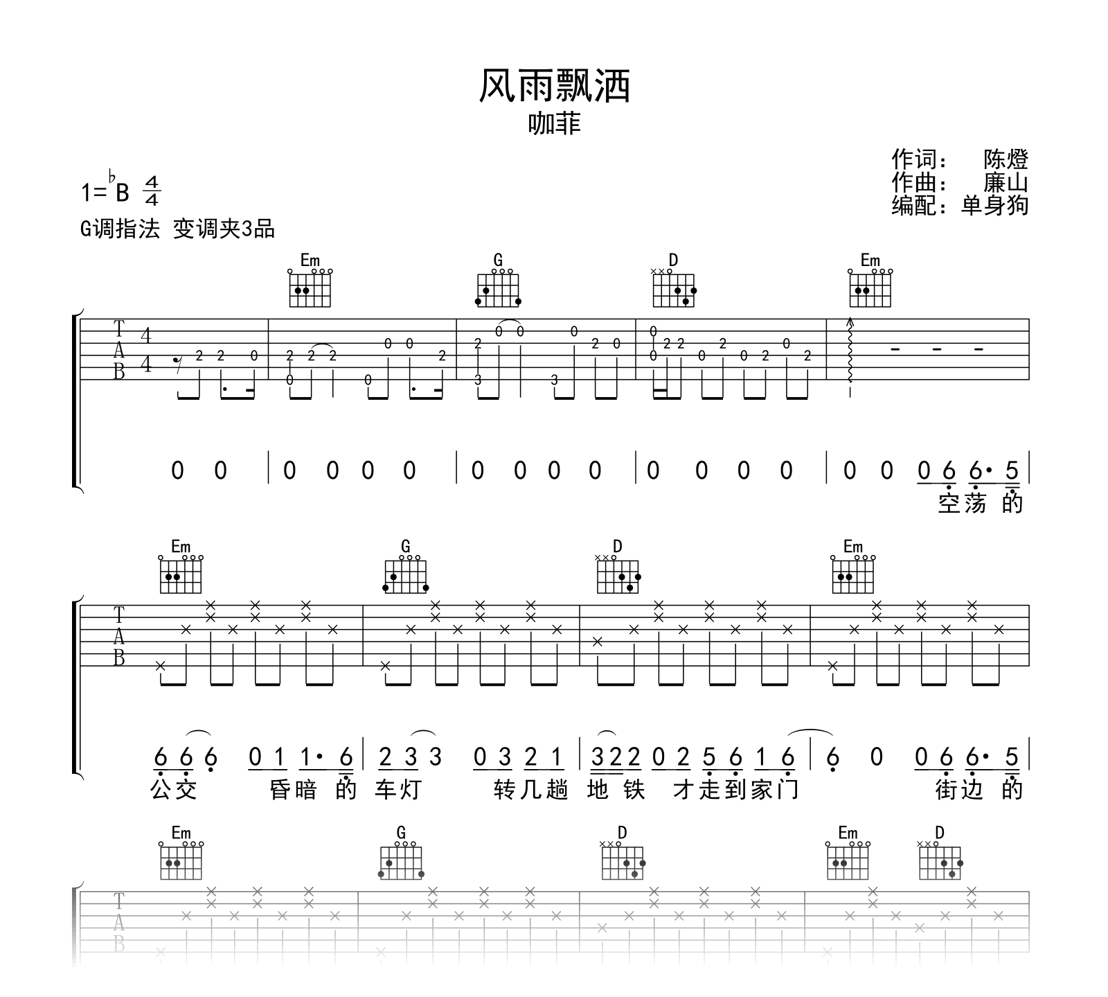 风雨飘洒吉他谱 - 咖菲 - G调吉他弹唱谱