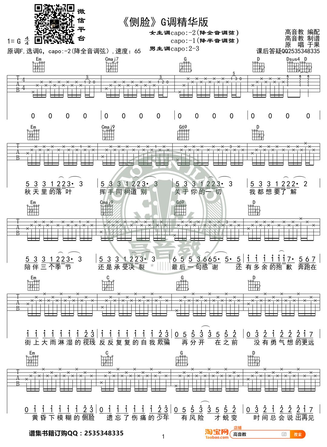 侧脸 于果 G调吉他谱 - 侧脸 - G调吉他弹唱谱