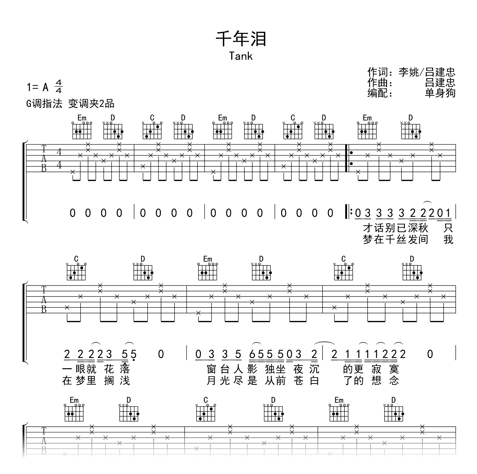 千年泪吉他谱 - Tank - G调吉他弹唱谱