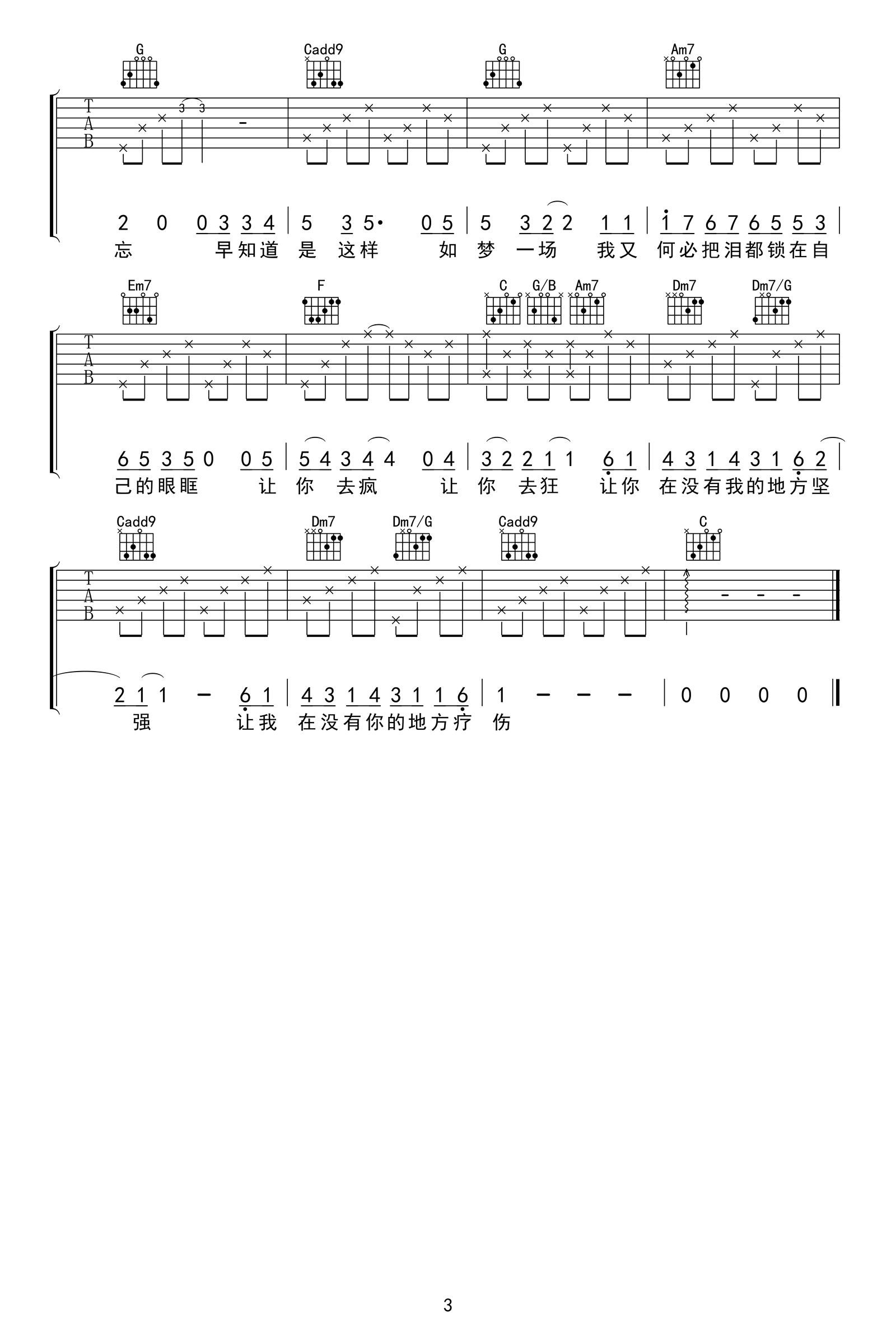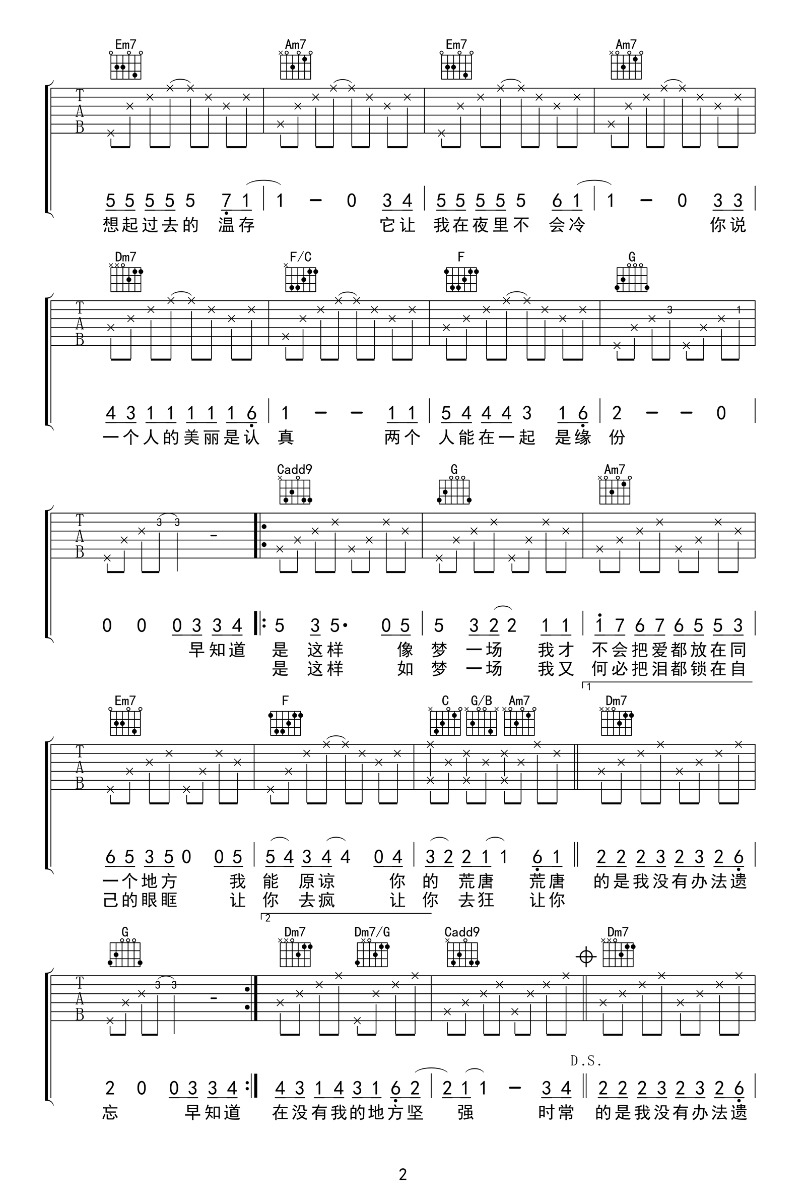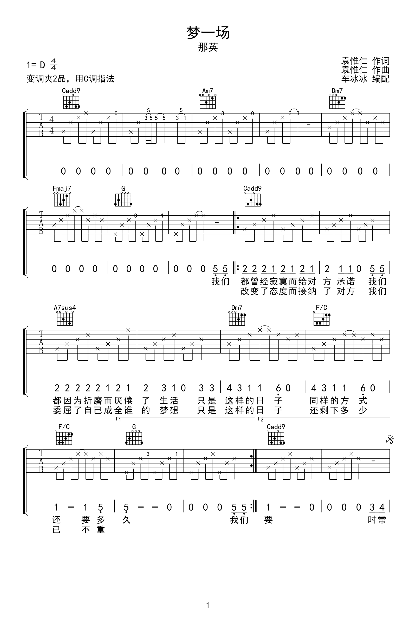 曲谱介绍: 梦一场吉他谱,那英演唱的一首经典老歌,袁惟仁作词作曲,《梦一场》吉他弹唱谱,原调D,变调夹夹二品,用C调指法编配,高清图片谱共三张六线谱。