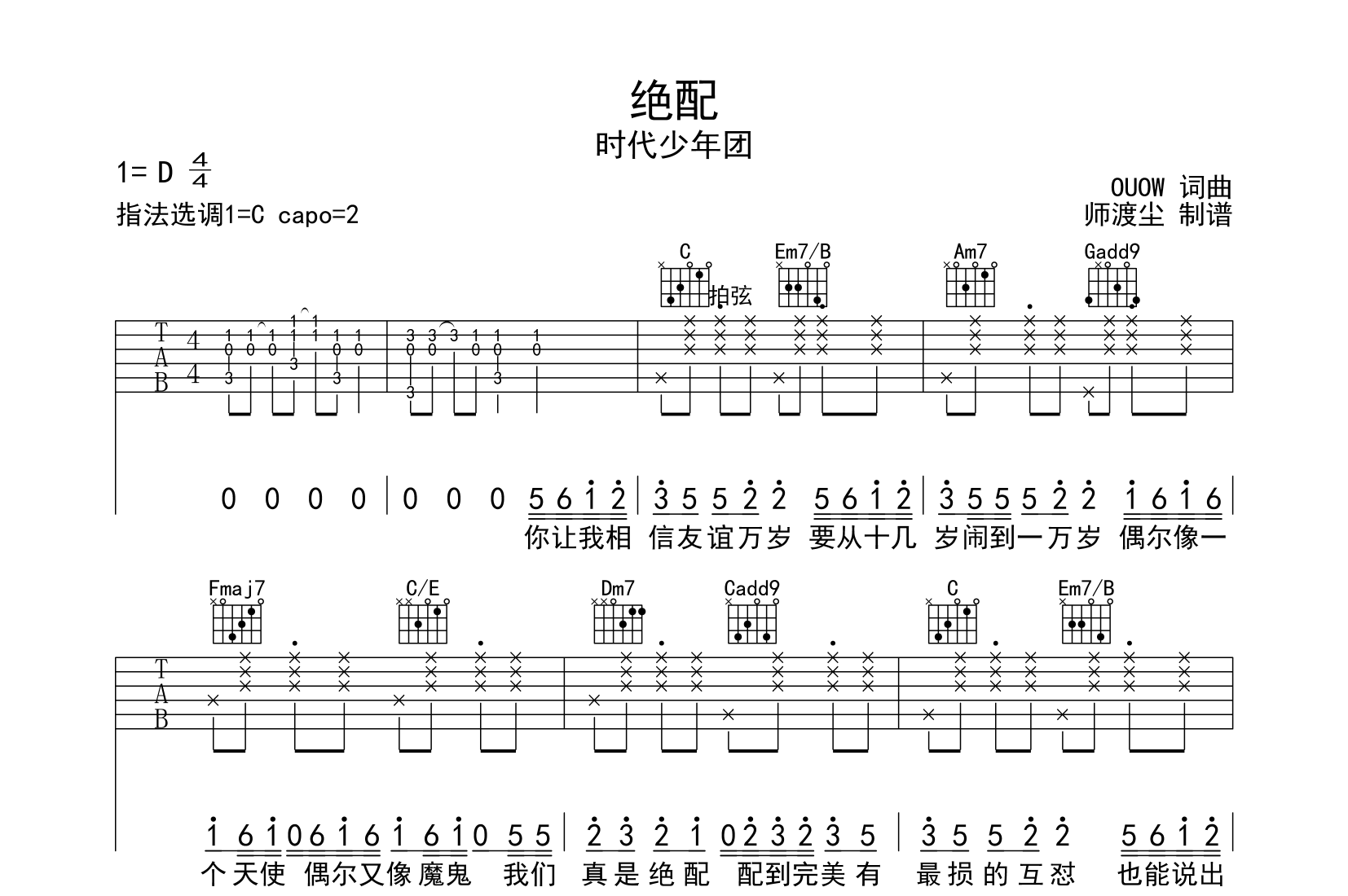 曲谱介绍: 绝配吉他谱,时代少年团演唱的歌曲,《绝配》吉他弹唱谱,C调指法编配吉他谱,变调夹夹2品,时代少年团演唱,共有6张高清图片谱,由师渡尘制谱分享。