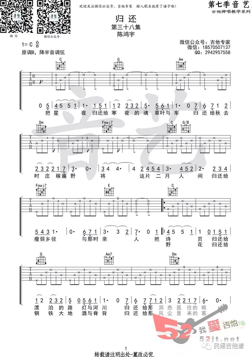 归还 陈鸿宇 C调吉他谱 - 归还 - C调吉他弹唱谱