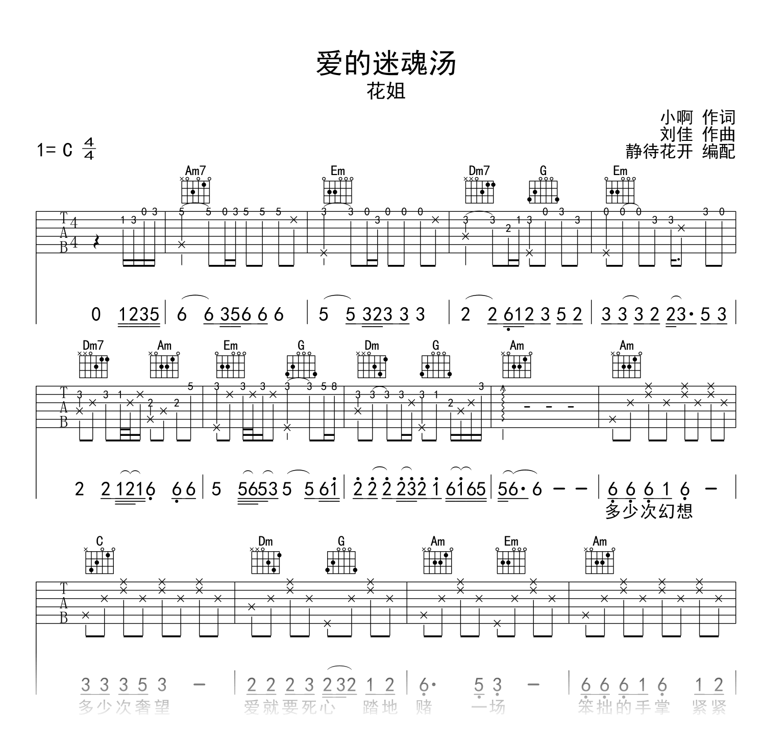 曲谱介绍: 爱的迷魂汤吉他谱,花姐演唱的一首网络伤感情歌,沧桑烟嗓一开口就让人心碎。《爱的迷魂汤》吉他弹唱谱,采用C调和弦指法编配,演奏不夹变调夹,速度控制在每分钟85拍左右,演奏难度简单。