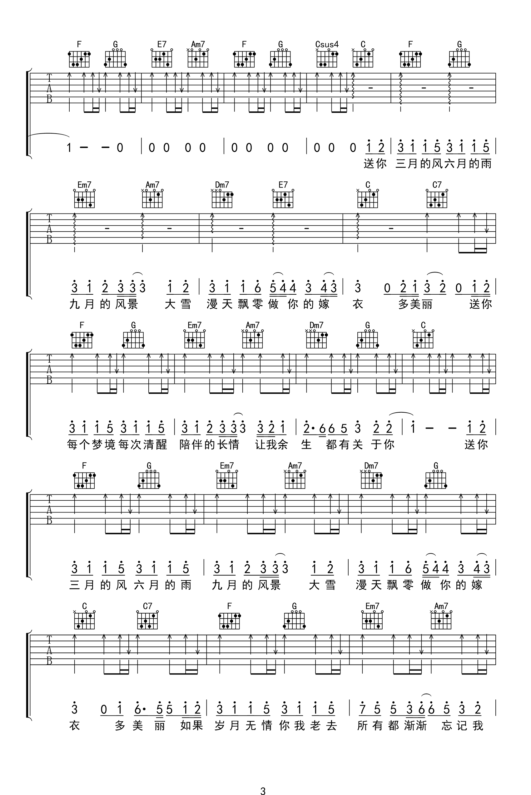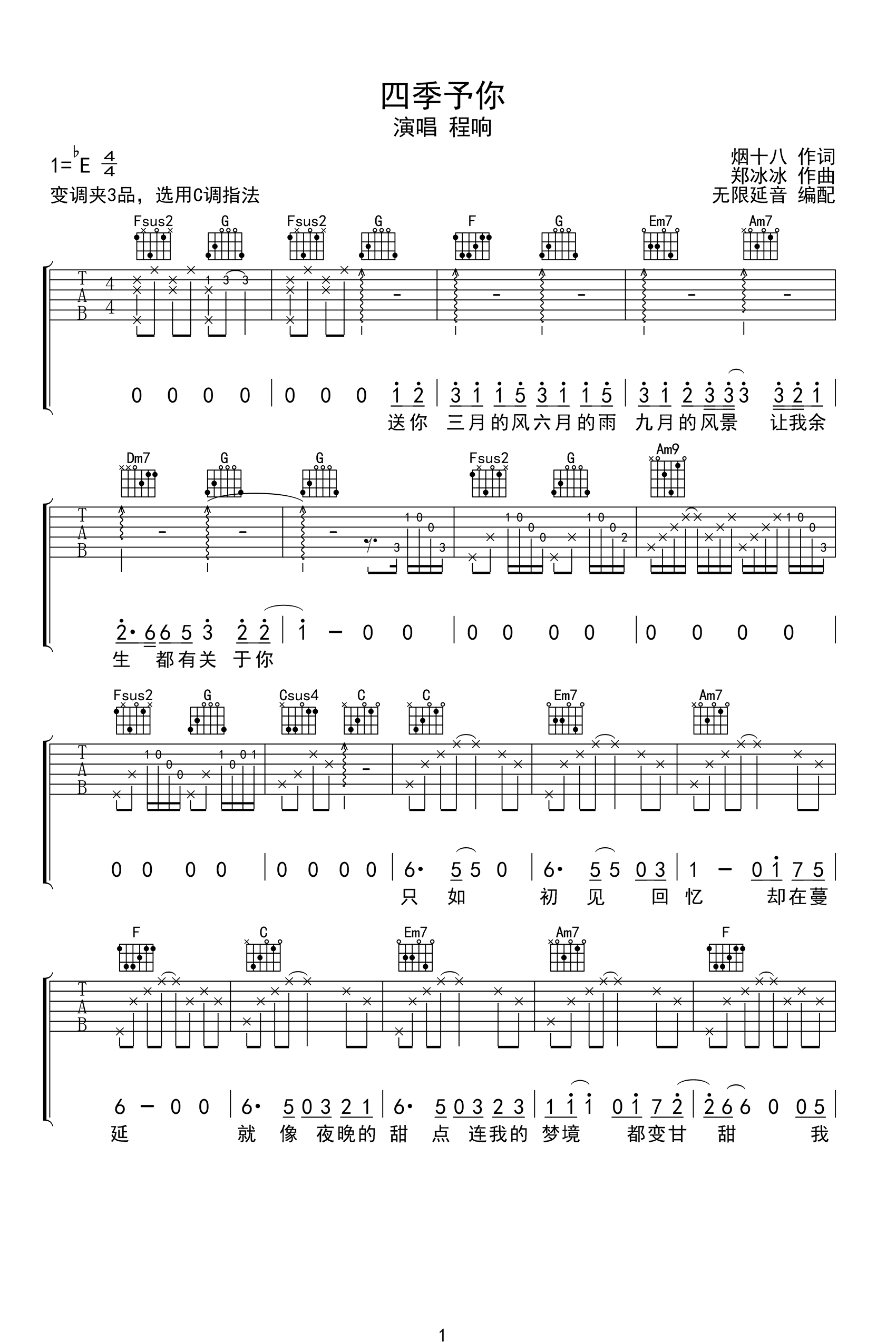曲谱介绍: 四季予你吉他谱,程响演唱的一首治愈好听的歌曲,《四季予你》吉他弹唱谱,原调降E调,选用C调指法编配,变调夹夹三品,完整编配共四张高清图片六线谱。