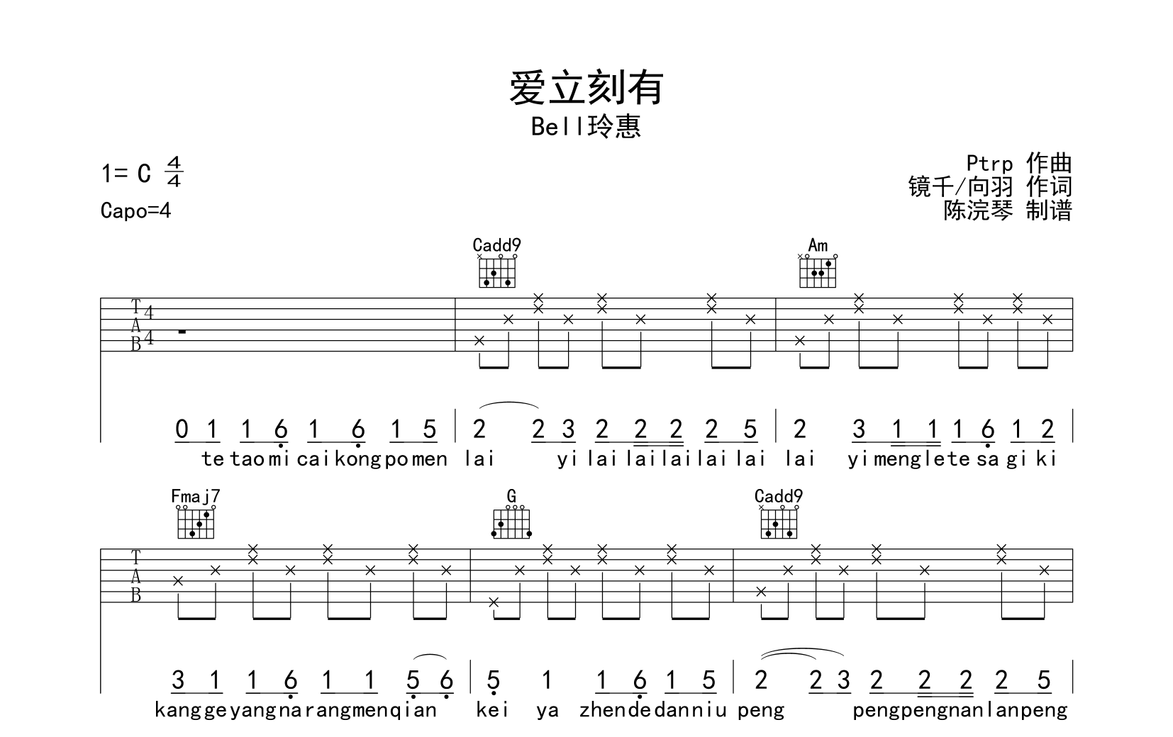 曲谱介绍: 《爱立刻有》吉他谱,Bell玲惠演唱的歌曲,《爱立刻有》吉他弹唱谱,选用C调指法编配,原调E调,CAPO夹4品弹唱原调,和弦简单,适合初学者学习使用,本谱共有3张高清图片谱,由陈浣琴制谱分享。