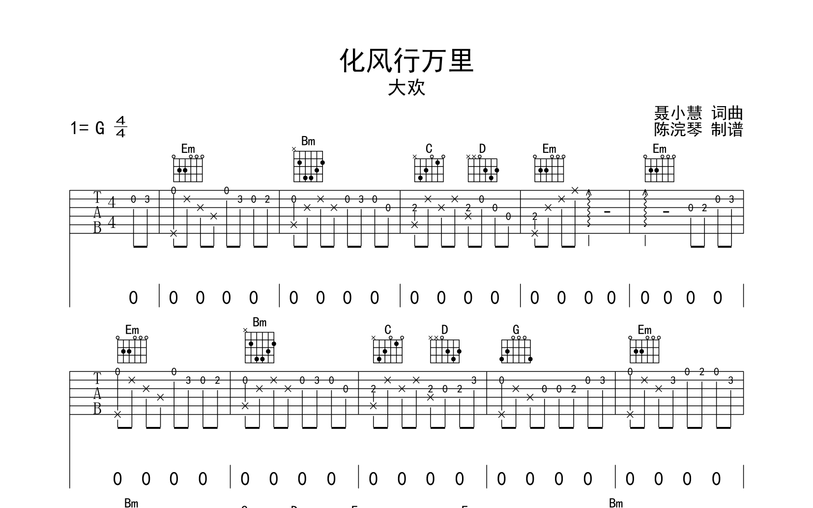 曲谱介绍: 化风行万里吉他谱,大欢演唱,《化风行万里》吉他弹唱谱,来自@陈浣琴编配扒谱制作,本吉他谱采用G调和弦指法编配,推荐变调夹夹第0品演奏,原调G调,也可以根据个人嗓音条件灵活选择变调夹位置,演奏的速度控制在每分钟75拍左右,演奏难度简单。