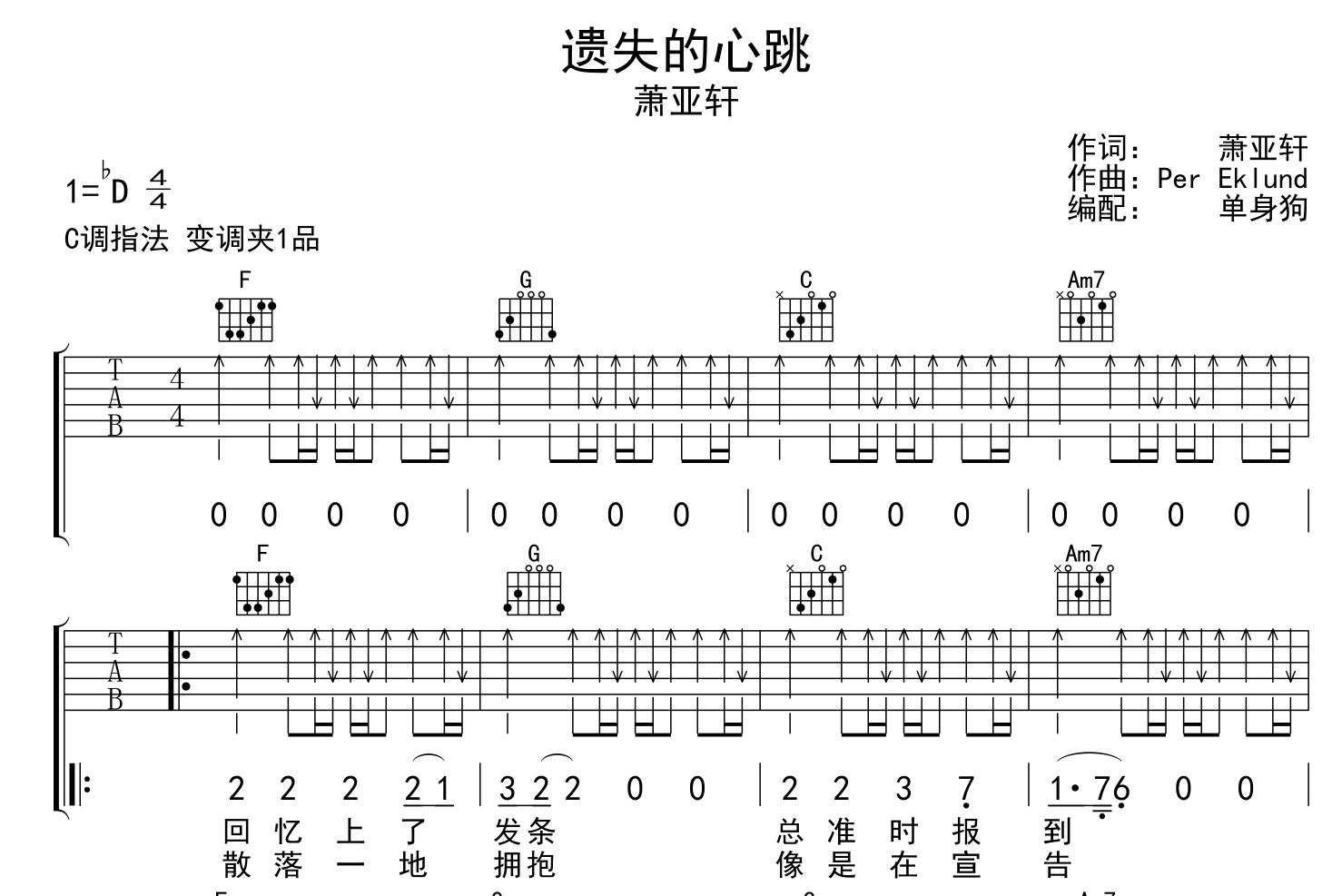 曲谱介绍: 《遗失的心跳》吉他谱,萧亚轩演唱的歌曲,《遗失的心跳》吉他弹唱谱,来自@单身狗编配扒谱制作,本吉他谱采用C调和弦指法编配,CAPO夹1品弹唱原调#C,可以根据个人嗓音条件灵活选择变调夹位置,演奏难度简单。共3张高清图片谱。