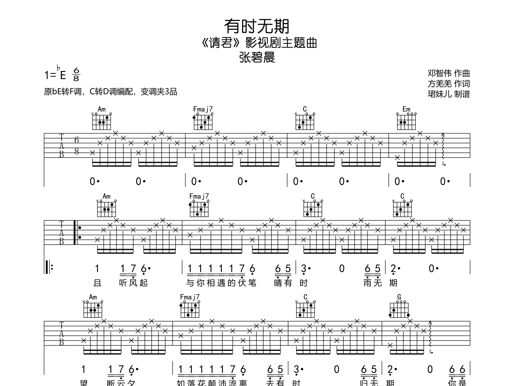 曲谱介绍: 《有时无期》吉他谱,张碧晨演唱的《请君》影视剧主题曲,《有时无期》吉他弹唱谱,由珺妹儿编配制谱,本谱采用C转D调指法编配,变调夹3品,速度85BPM,难度较简单,易上手。共有2张高清图片谱例。