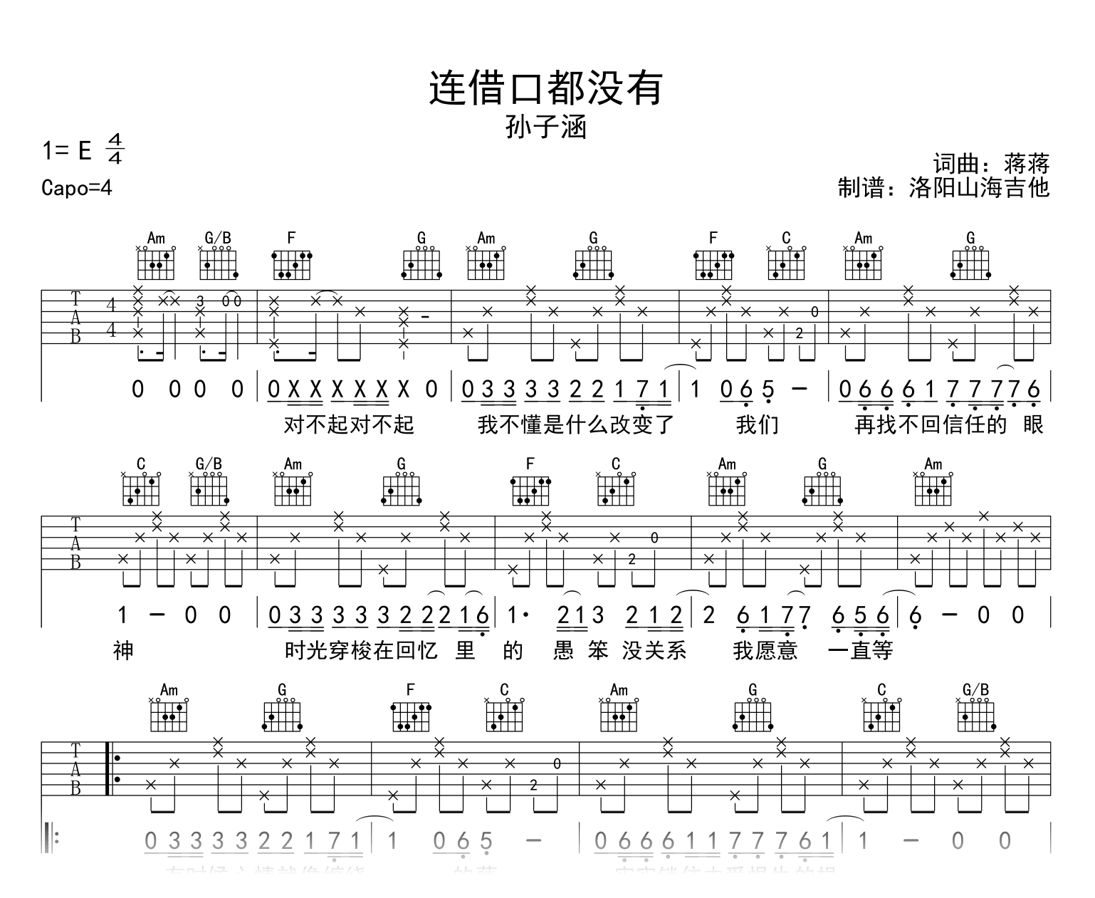 曲谱介绍: 连借口都没有吉他谱,孙子涵回忆杀歌曲,一首曾经风靡网络的伤感情歌。《连借口都没有》吉他弹唱六线谱,原调E,选用C调和弦指法编配,变调夹夹第四品,完整六线谱共两张高清图片。