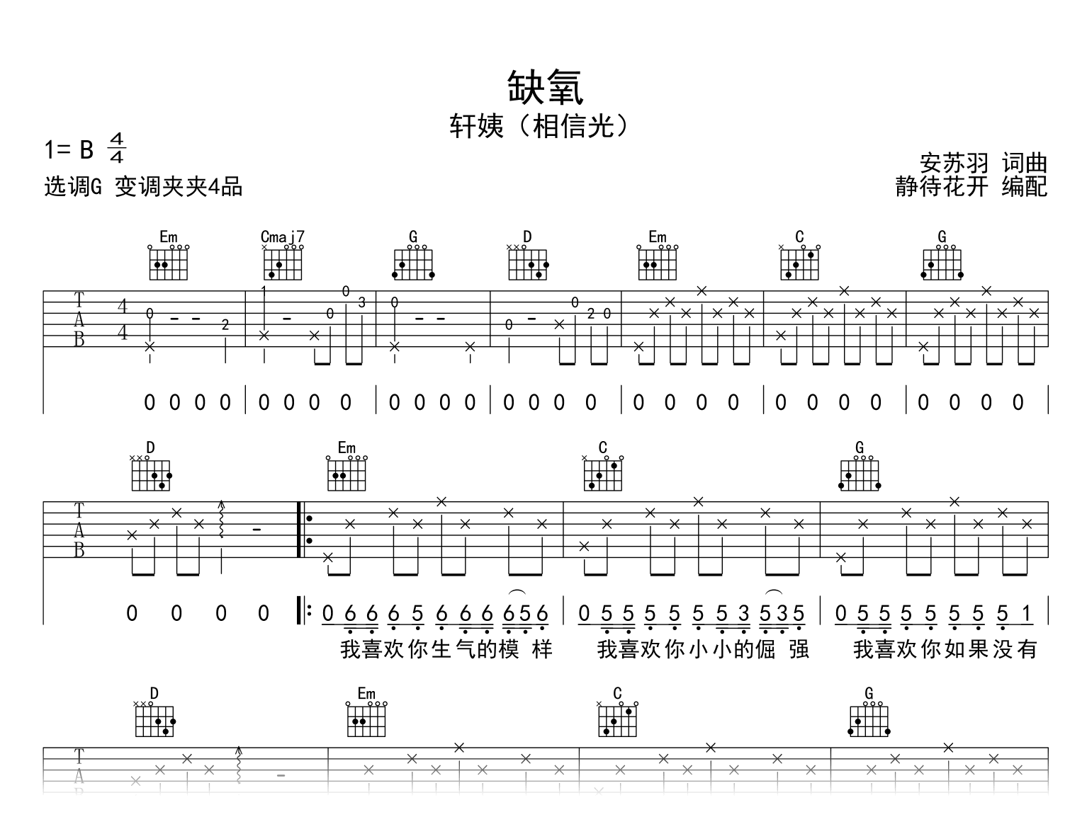 曲谱介绍: 缺氧吉他谱,轩姨(相信光)演唱,《缺氧》吉他弹唱谱,编配采用G调和弦指法,变调夹夹四品位置,原调B调,速度大约每分钟85拍,演奏难度简单。