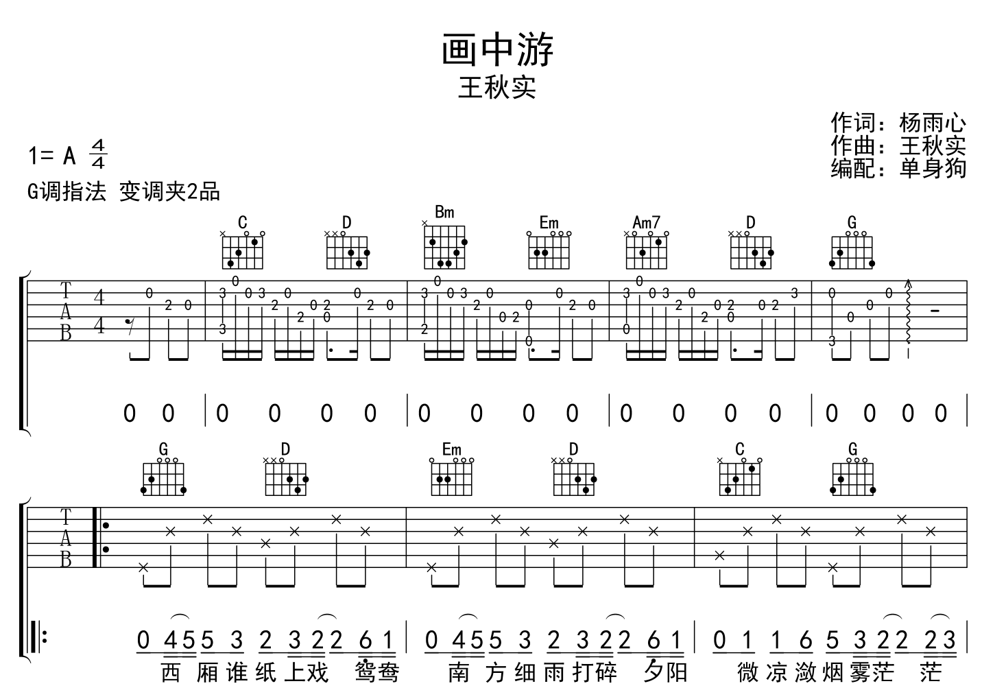 曲谱介绍: 《画中游》吉他谱,王秋实演唱,《画中游》吉他弹唱谱,来自@单身狗编配扒谱制作,本吉他谱采用G调和弦指法编配,原调A调,CAPO夹2品,也可以根据个人嗓音条件灵活选择变调夹位置,演奏难度简单。共有2张高清图片谱。