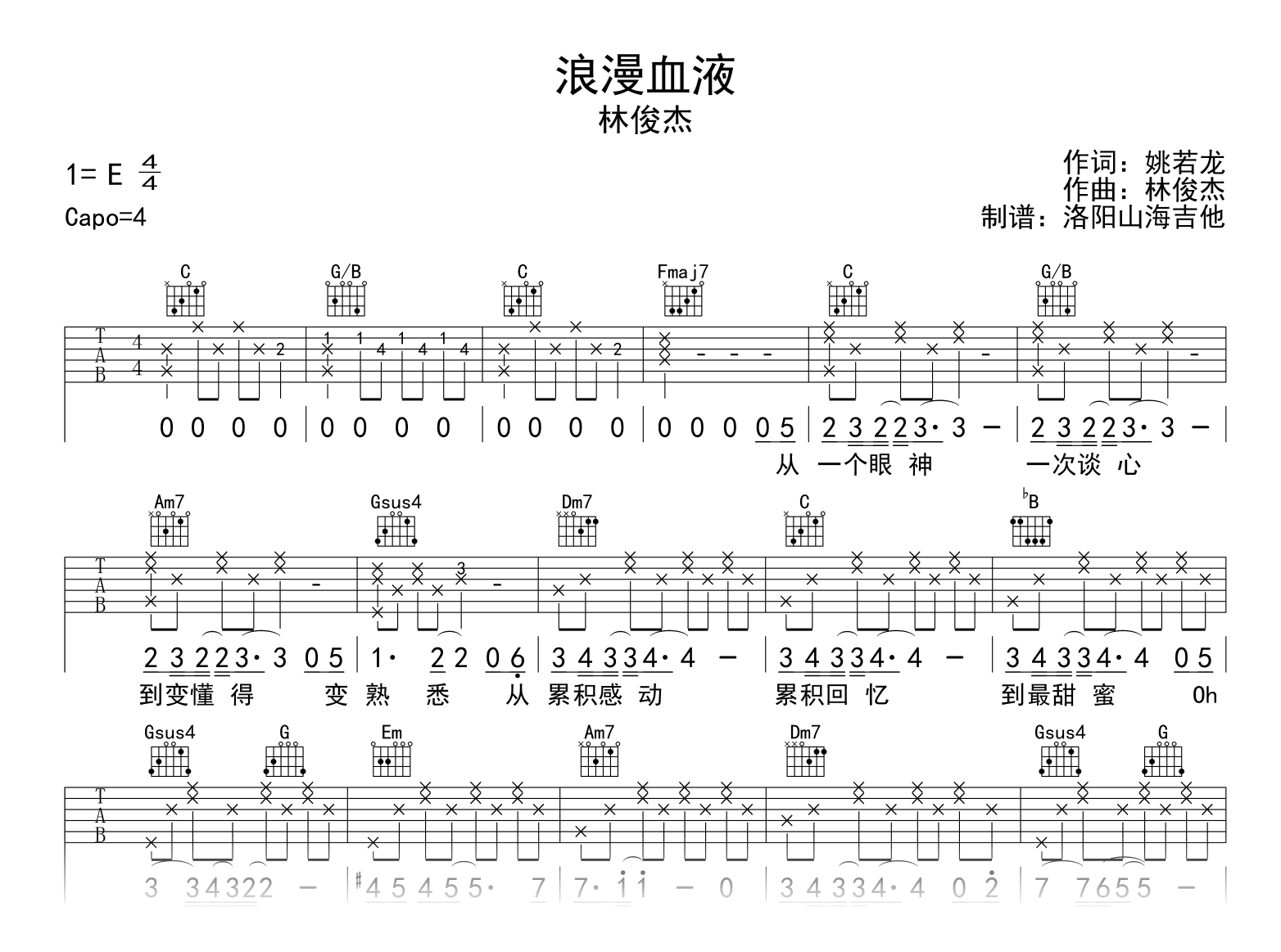 曲谱介绍: 浪漫血液吉他谱,林俊杰的经典歌曲,《浪漫血液》吉他弹唱谱,原调E,选用C调指法编配,Capo夹四品。完整六线谱共两张高清图片谱。 喜欢这首歌的大概都是恋旧的人吧,无论遭受多少伤痛,依旧坚持奋斗,为了梦想,爱情,心中的光芒不停前行,这就是浪漫血液带给我们的真正的罗曼蒂克。