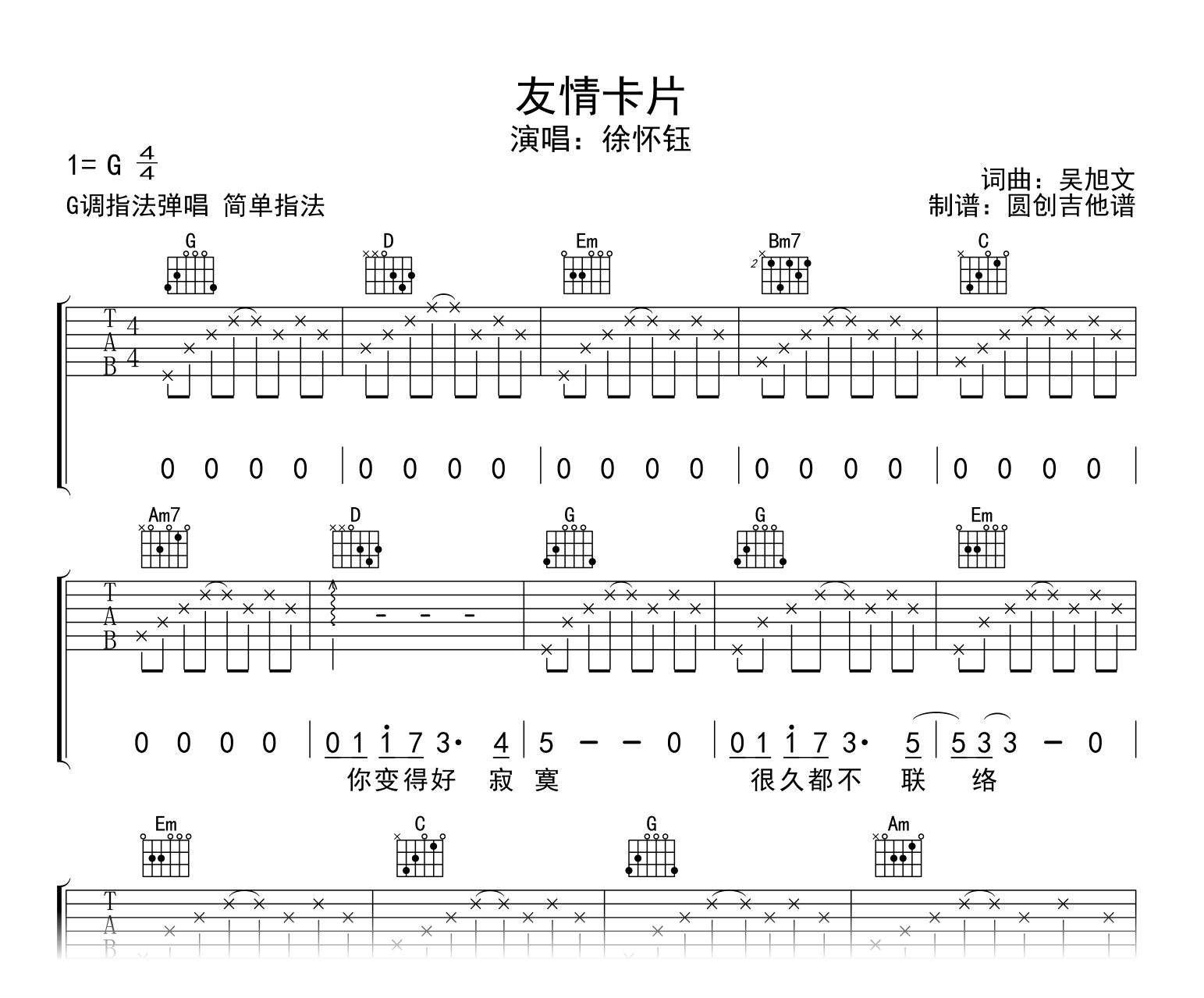 曲谱介绍: 《友情卡片》吉他谱,由徐怀钰演唱的经典歌曲。原调编配采用G调和弦指法,演奏难度简单,适合多数琴友弹唱选择。随谱附上示范音频,琴友可先试听再选择购买。 友情和爱情,只隔着一首歌的距离。怀旧歌词,抒情的曲调,柔情的嗓子,释放独特的魅力,瞬间给人带入感。