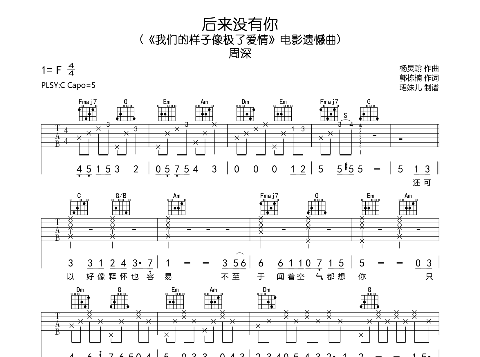 曲谱介绍: 《后来没有你》吉他谱, 周深演唱(《我们的样子像极了爱情》电影遗憾曲),《后来没有你》吉他弹唱谱,本谱采用C调指法编配,弹唱建议变调夹5品,速度85BPM,难度较简单,易上手。共有2张高清图片谱例。