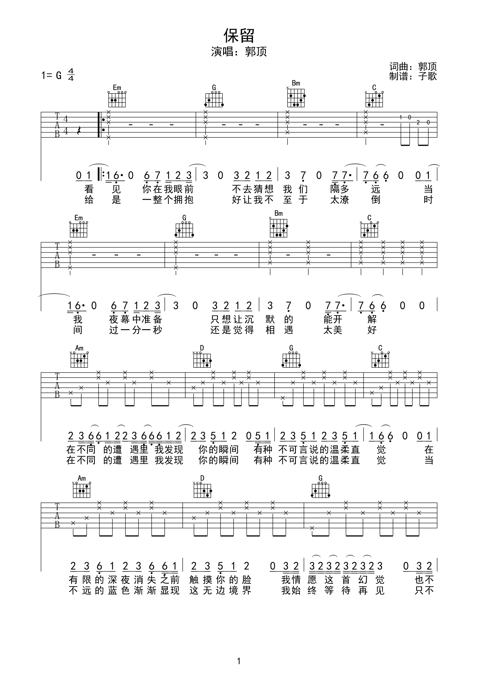 保留吉他谱 - 郭顶 - G调吉他弹唱谱