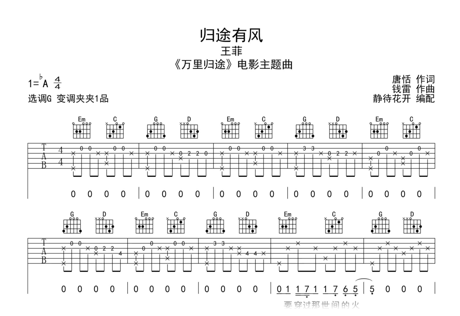 曲谱介绍: 归途有风吉他谱,王菲演唱,电影《万里归途》主题曲,《万里归途》吉他弹唱谱,原调降A,选用G调指法编配,变调夹夹第一品位置,演奏速度大约每分钟80拍,这首歌曲难度简单。