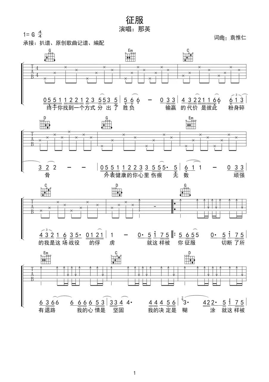 曲谱介绍: 征服吉他谱_那英_《征服》C调原版六线谱_吉他弹唱教学分享,《征服》是由那英演唱的一首经典老歌。这首歌说是脍炙人口也不会太过,那英那种略带沙哑的声音,加上这首歌本来就是一种类似呐喊的唱法,使得这首歌听起来就比较激昂,唱出了征服者与被征服者的感觉。