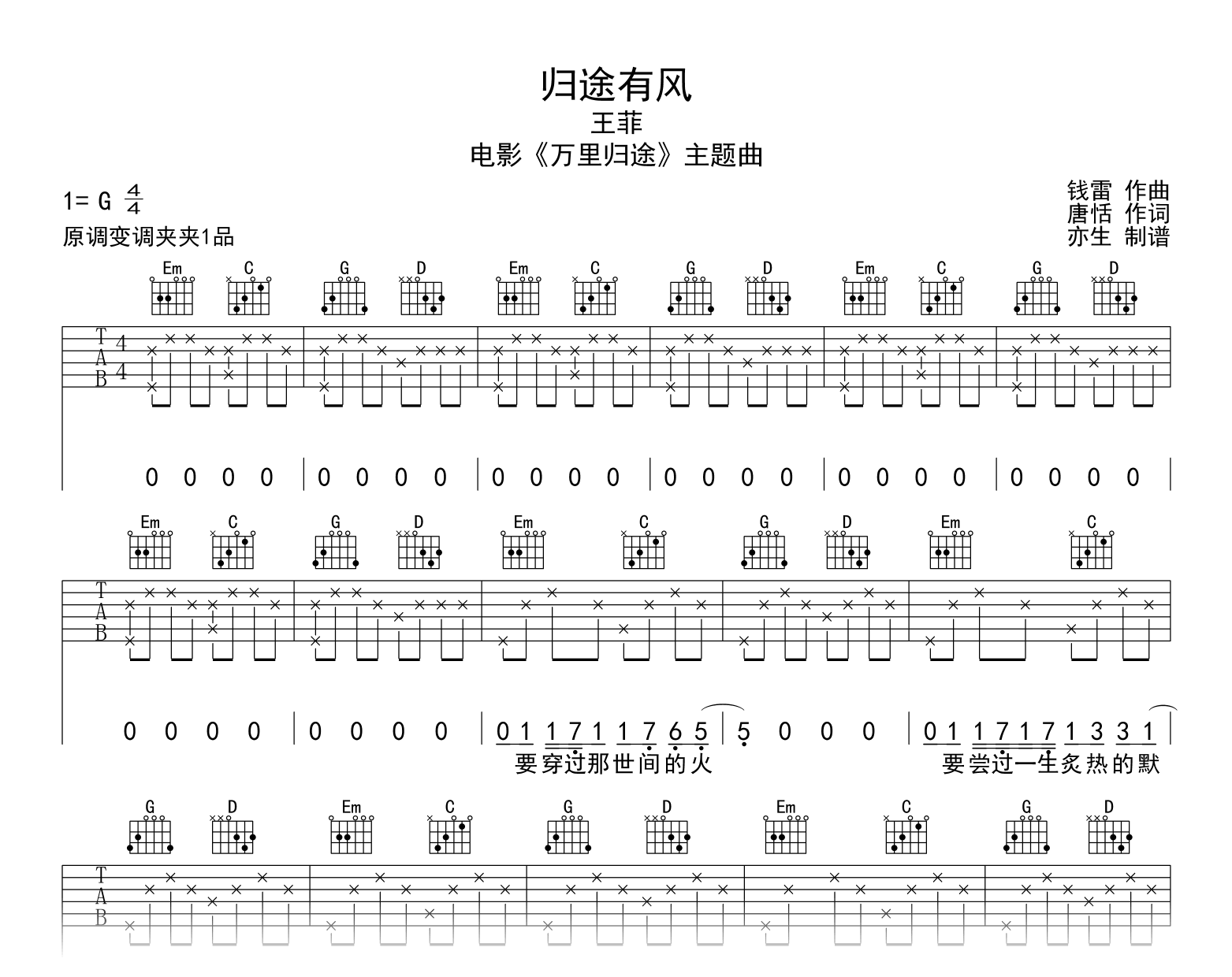 曲谱介绍: 归途有风吉他谱,王菲新歌,电影《万里归途》主题曲,独特的音色与唱腔,搭配真挚感人的歌词,让这条归途格外触动人心。借这首歌,像风一样一声声呼唤着满身风沙的人:别睡着了,要走向篝火,走向爱人,走向希望。 《归途有风》吉他六线谱,采用G调和弦指法,变调夹夹第一品,节奏4/4拍,弹唱速度大约每分钟95拍,演奏难度简单。