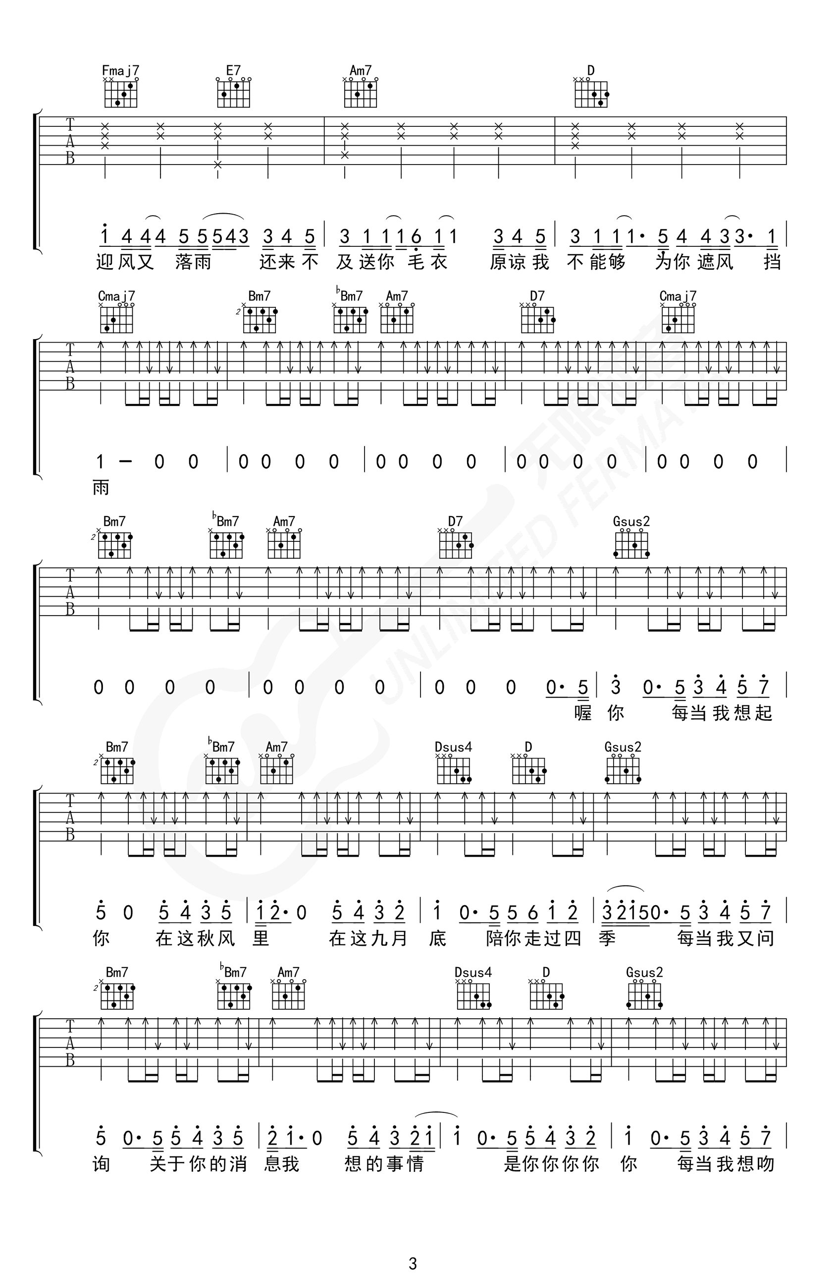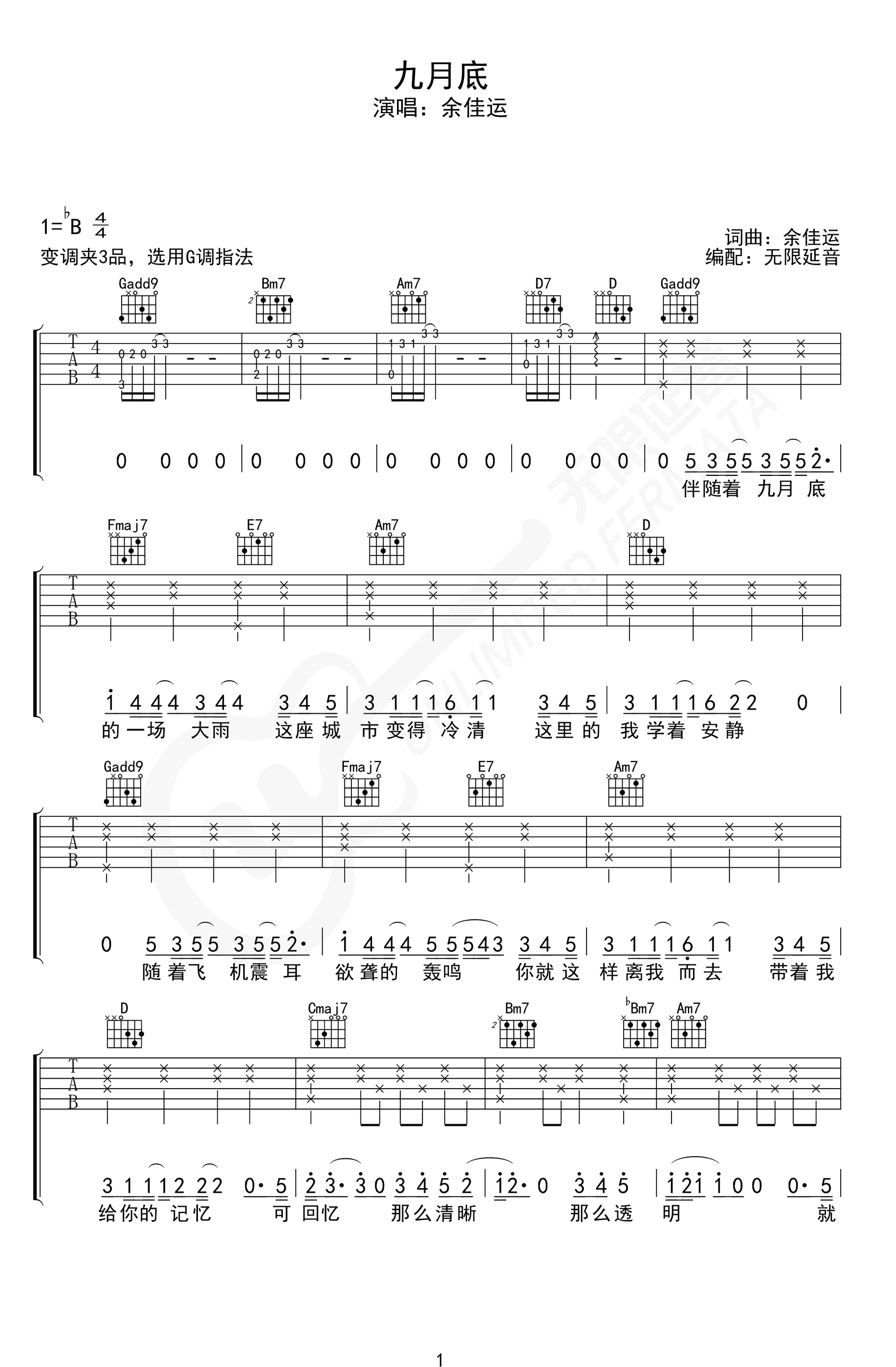 曲谱介绍: 九月底吉他谱,余佳运演唱的一首经典代表作品,此时再聆听时的心情,是否变得不同了呢?《九月底》吉他弹唱谱,原调bB,变调夹夹三品,选用G调指法编配,完整版共四张高清图片六线谱。