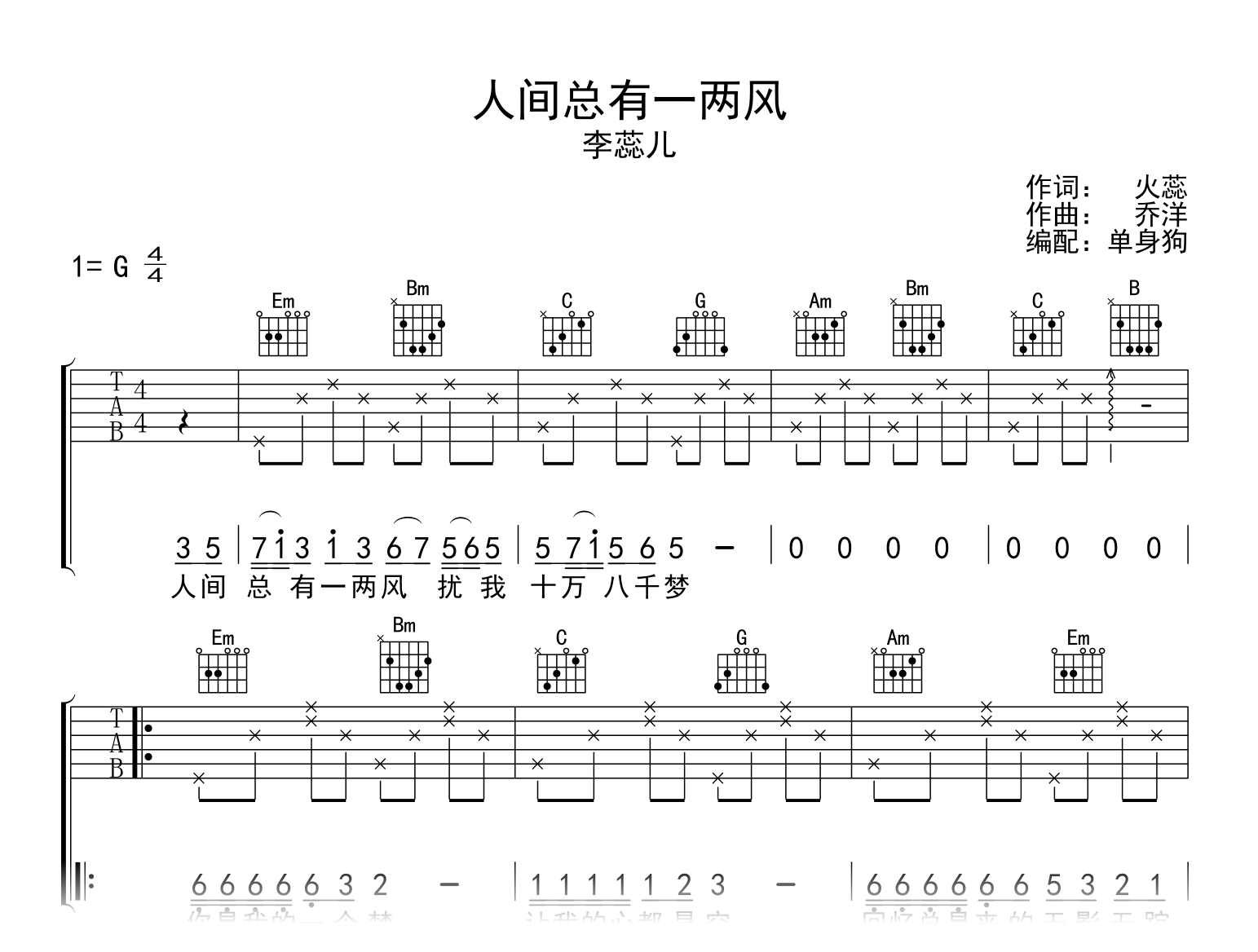 曲谱介绍: 李蕊儿《人间总有一两风》吉他弹唱谱,采用G调指法编配,共有2张高清图谱,免翻页排版设计。