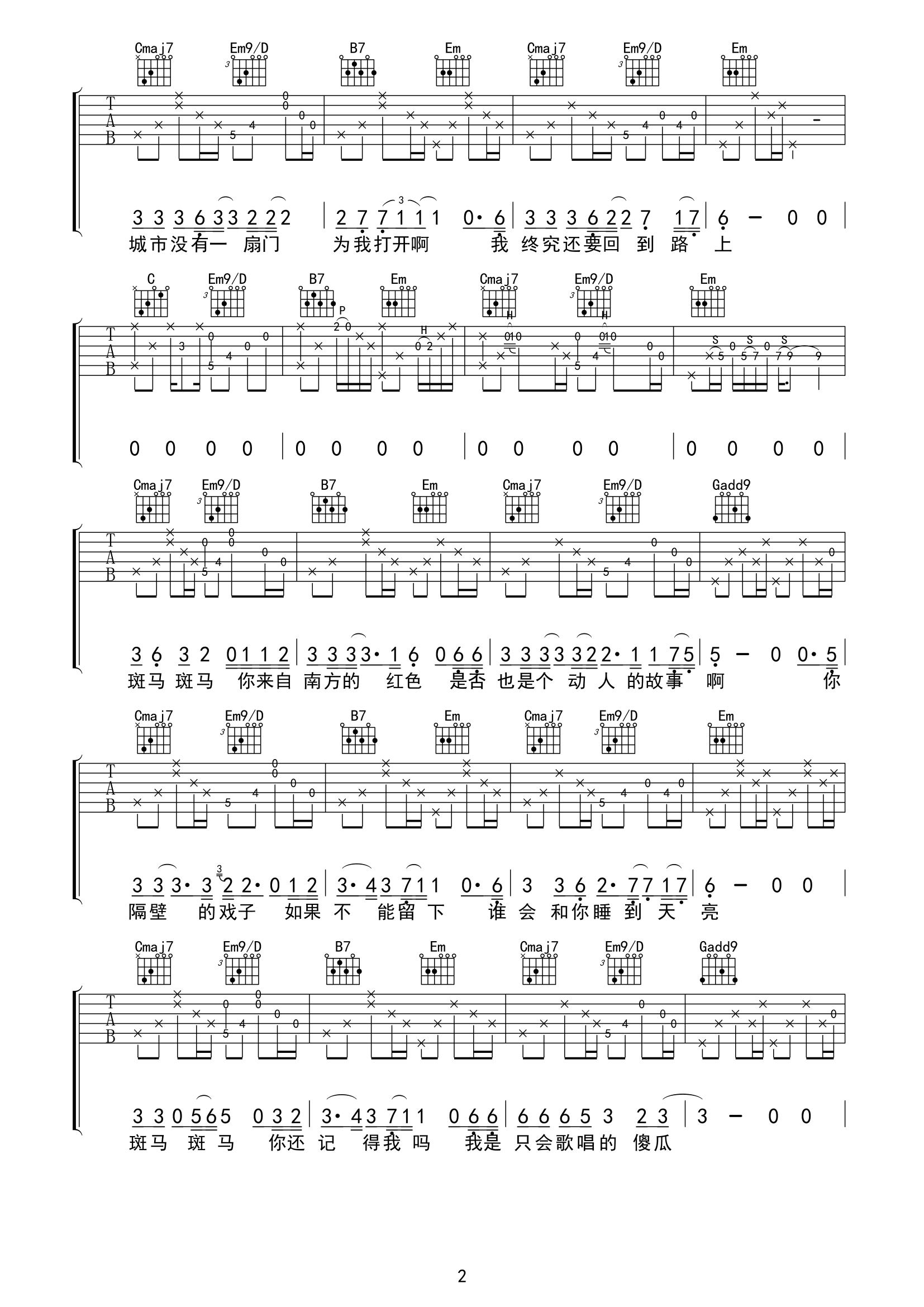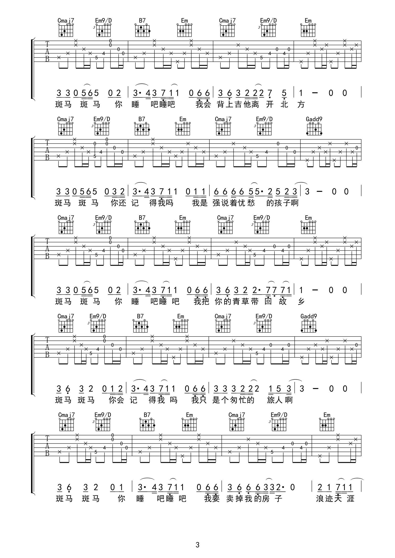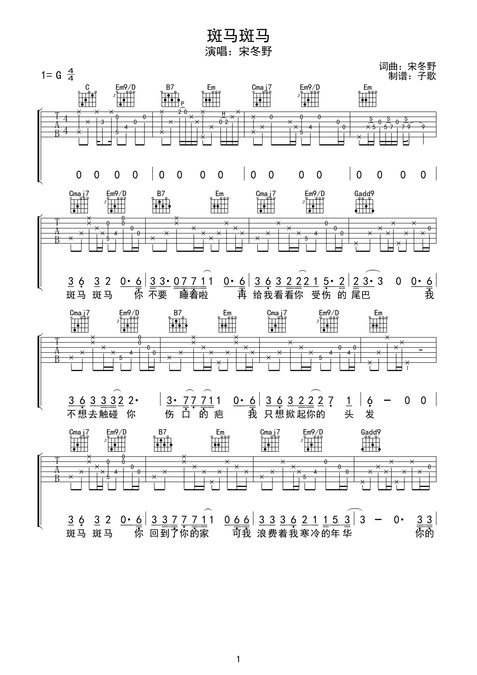 曲谱介绍: 宋冬野《斑马斑马》吉他弹唱谱,采用G调指法编配,共有5张高清图谱。