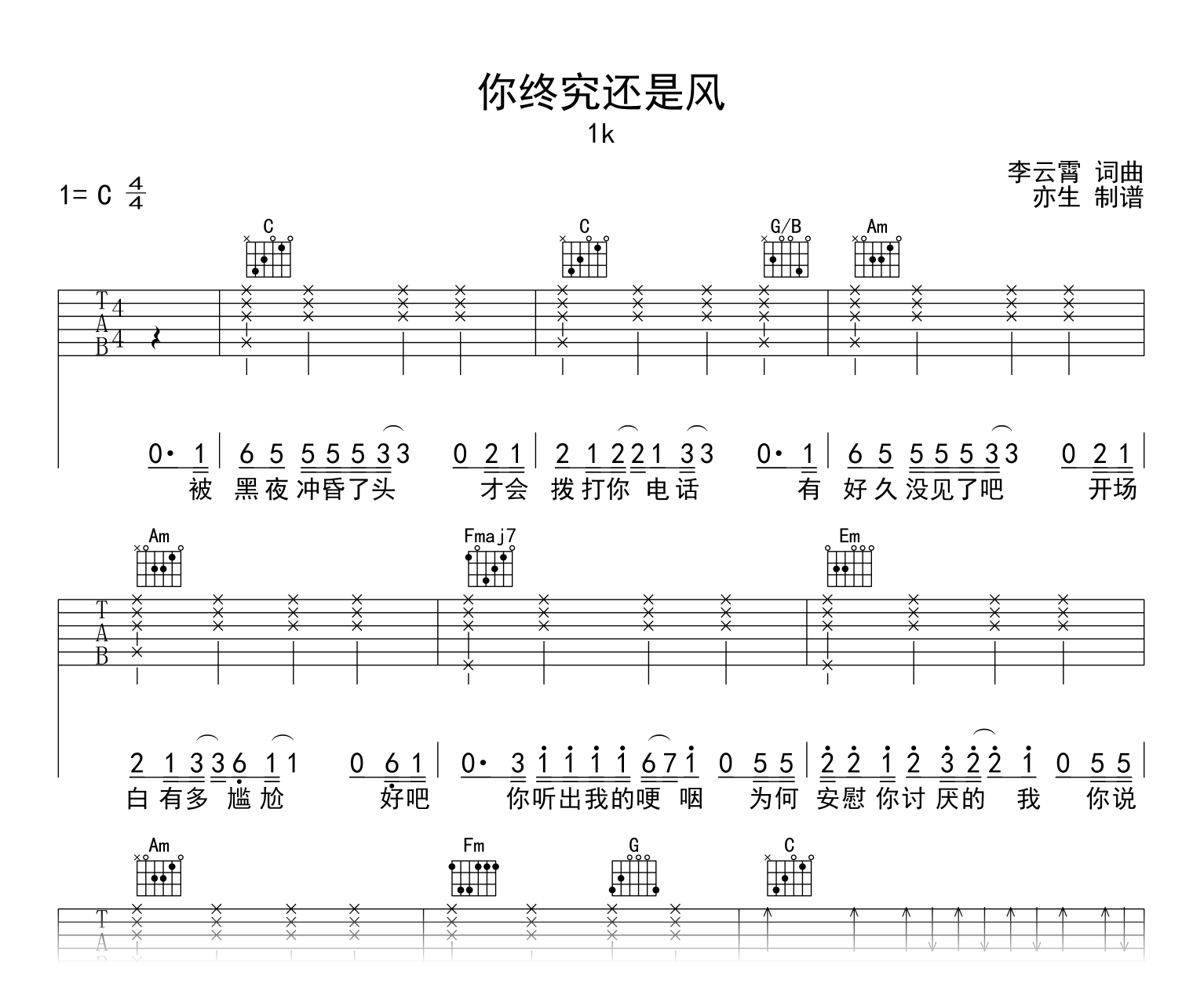 你终究还是风吉他谱 - 1K - C调吉他弹唱谱