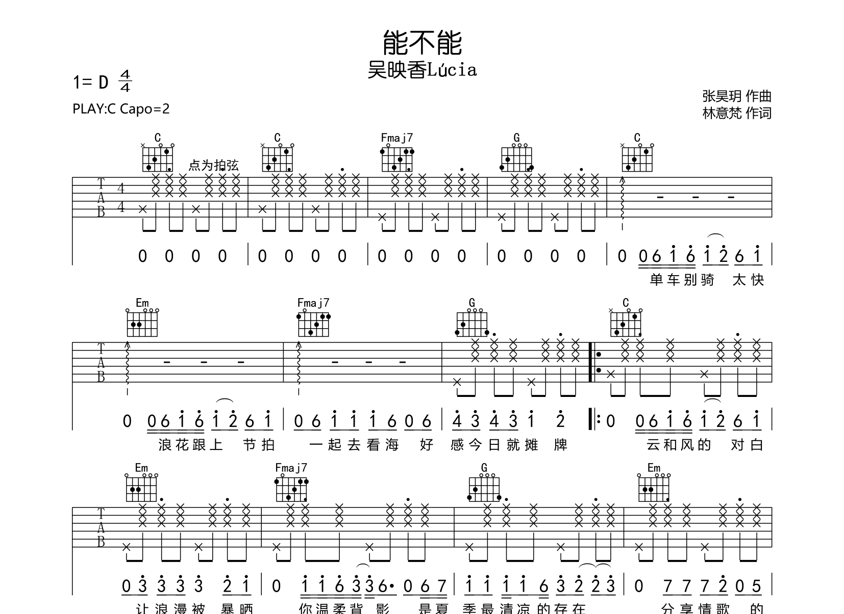 曲谱介绍: 能不能吉他谱,吴映香Lúcia演唱,能不能吉他弹唱谱,由珺妹儿编配制谱,此谱采用C调和弦指法演奏,CAPO夹2品弹唱原调D调,节奏4/4拍,演奏速度大约每分钟95拍,演奏难度简单。共3张高清图片谱。