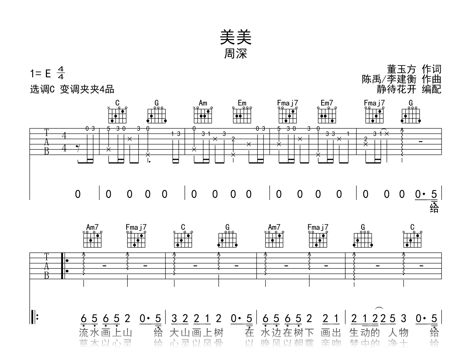 曲谱介绍: 美美吉他谱,周深演唱,中国动画百年纪念曲。清澈明亮的歌喉、娓娓道来的诠释,让我们一起探民族风格百年路,与民族自信下的少年们一起,共绘中国人文艺术气派。 《美美》吉他弹唱谱,编配采用C调和弦指法,变调夹夹第4品,原调E调,也可以根据个人嗓音灵活选择变调夹位置,速度大约每分钟80拍,演奏难度简单。