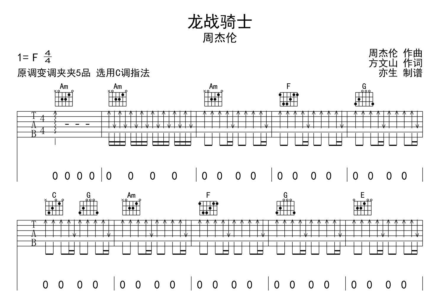 曲谱介绍: 《龙战骑士》吉他谱,周杰伦演唱,《龙战骑士》吉他弹唱谱,亦生编配制谱,本吉他谱采用C调和弦指法演奏,推荐变调夹夹第5品,节奏4/4拍,演奏速度大约每分钟110拍,演奏难度简单。共有3张高清图片谱。