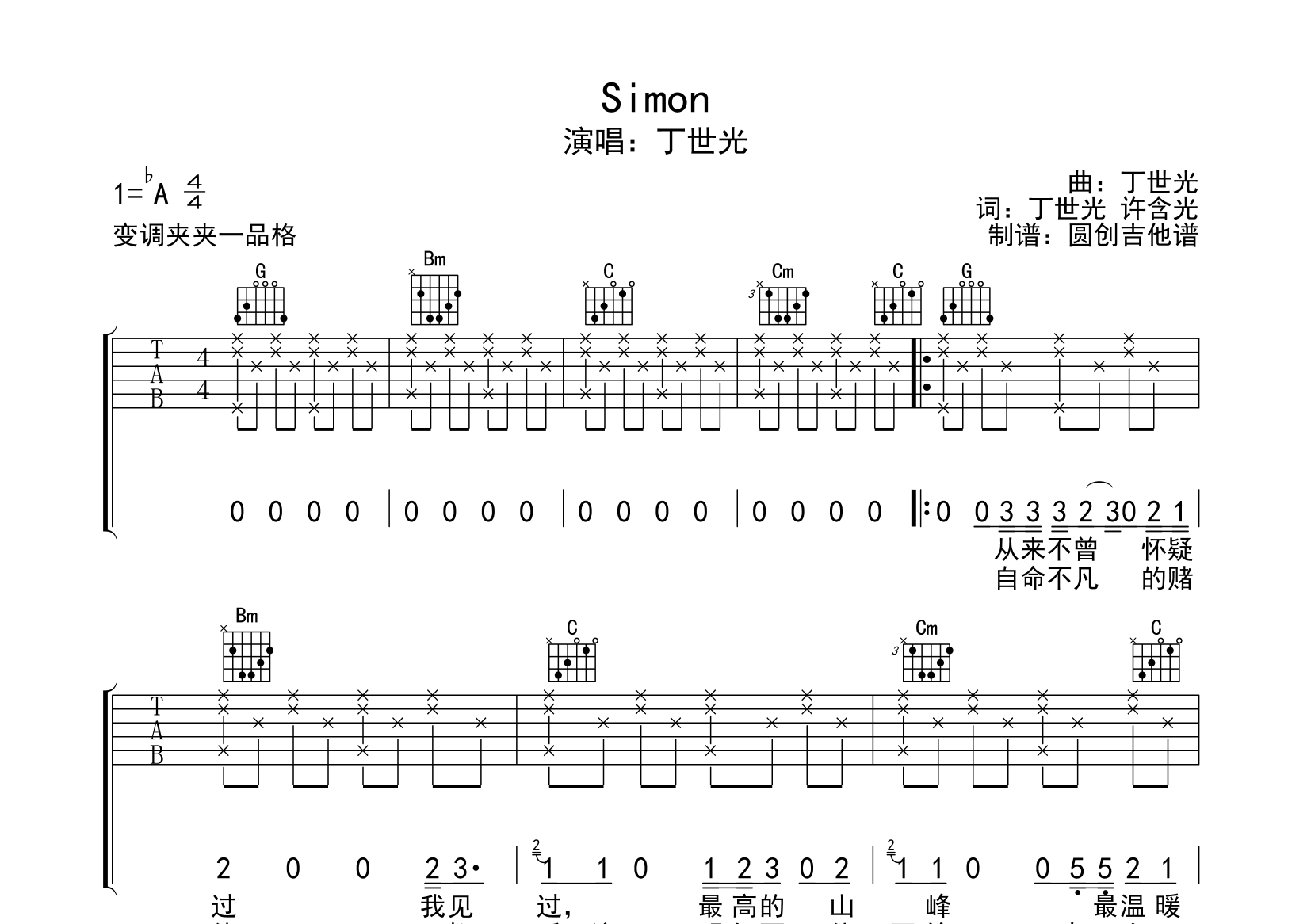 Simon吉他谱 - 丁世光 - G调吉他弹唱谱 - 原版