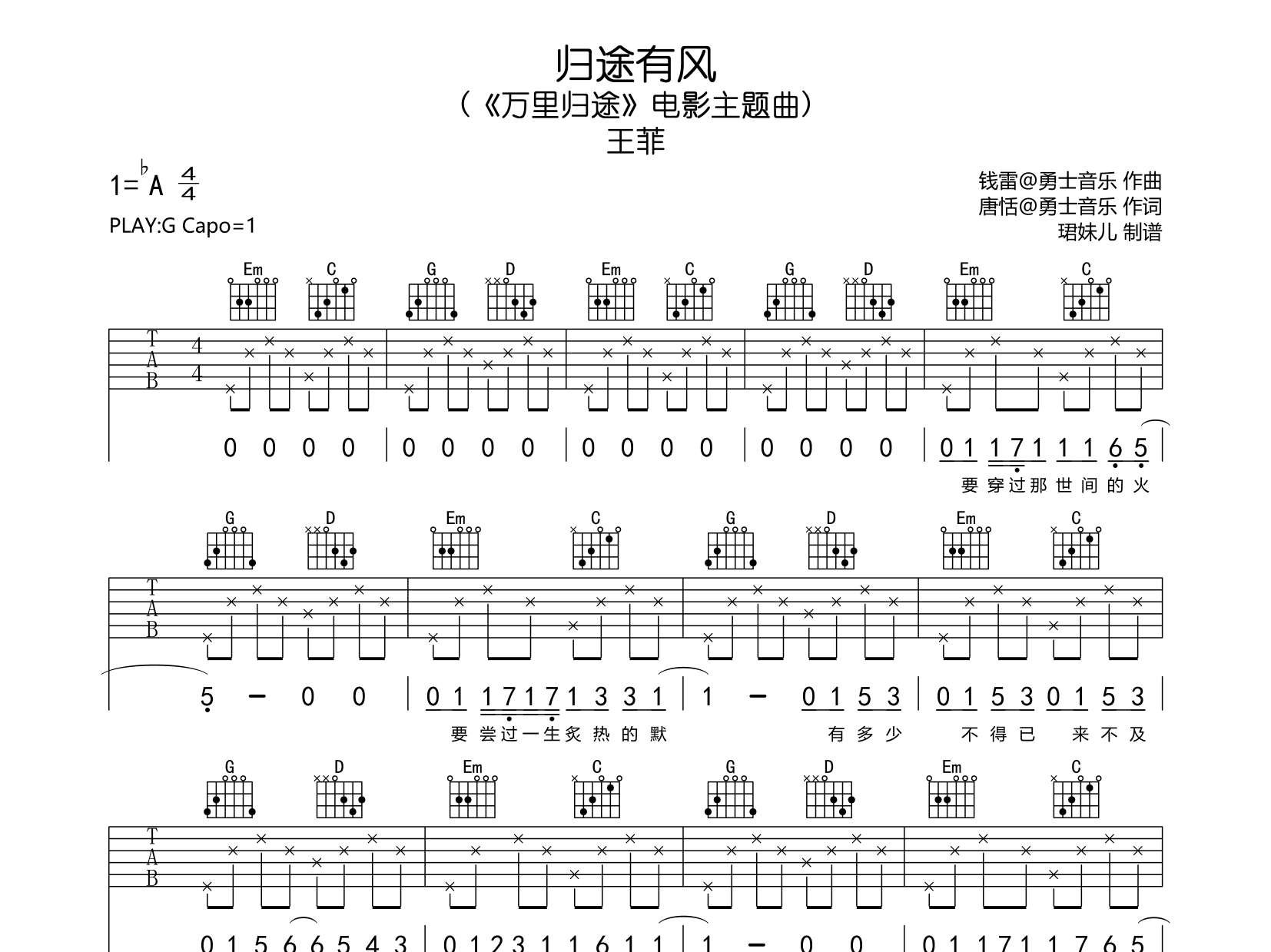 曲谱介绍: 《归途有风》吉他谱,王菲演唱的《万里归途》电影主题曲,《归途有风》吉他弹唱谱,本谱采用G调指法编配,弹唱建议变调夹1品,速度85BPM,难度较简单,易上手。共有4张高清图片谱例。