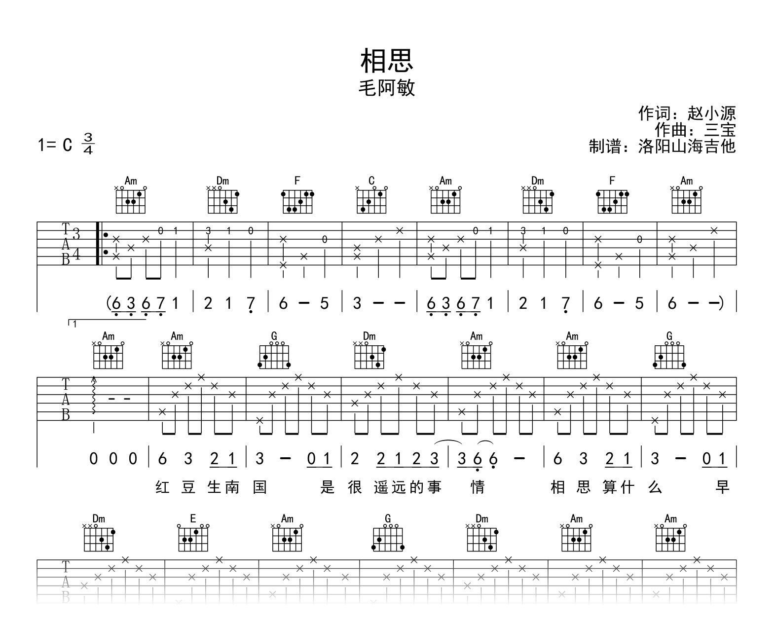 曲谱介绍: 相思吉他谱,毛阿敏演唱的一首经典老歌,《西游记后传》主题曲。《相思》吉他弹唱谱,选用原调C调和弦指法编配,完整编配共两张图片谱例。
