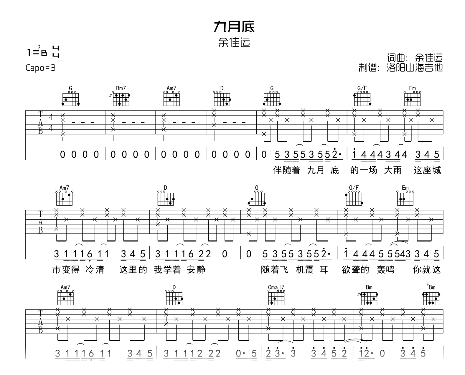 曲谱介绍: 九月底吉他谱,余佳运演唱,前奏听起来很舒服,是下雨的声音,似乎这场雨过后才是秋,结尾的伴奏也有雨还有时间的滴答声,时间和雨都在流逝,时间永远不会停留在这秋风里,在这九月底。 《九月底》吉他弹唱六线谱,原调降B,Capo夹三品,选用C调指法编配,完整版共两张高清图片谱。