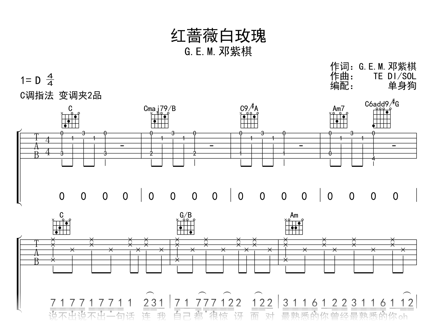 曲谱介绍: 红蔷薇白玫瑰吉他谱,邓紫棋的一首经典热门曲目,很旧的歌也不断的被很新的人爱 ​。唱腔像氤氲的迷雾,描绘出一幅唯美感伤的画:一朵玫瑰躺在月亮下,纪念着曾经最真挚的爱。 《红蔷薇白玫瑰》吉他弹唱谱,原调D,选用C调指法,变调夹夹第二品,完整版共四张高清图片谱。