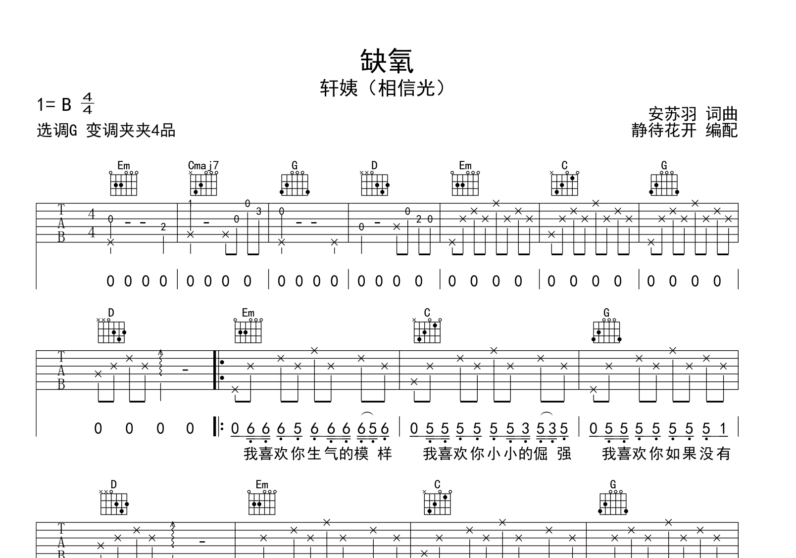 曲谱介绍: 缺氧吉他谱,轩姨(相信光)演唱的版本,缺氧吉他弹唱谱,来自@静待花开编配吉他谱,采用G调和弦指法演奏,推荐变调夹夹第4品,原调B调,也可以根据个人嗓音灵活选择变调夹位置,演奏速度大约每分钟*拍,演奏难度简单。