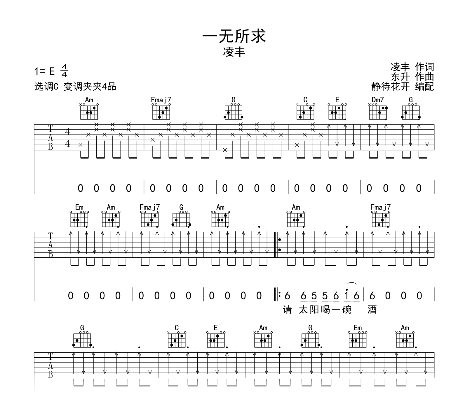 曲谱介绍: 一无所求吉他谱,凌丰演唱。《一无所求》吉他弹唱谱,原调E调,编配选用了C调和弦指法,变调夹夹第四品,也可以个人嗓音灵活调整变调夹位置,速度大约每分钟85拍,演奏难度简单。