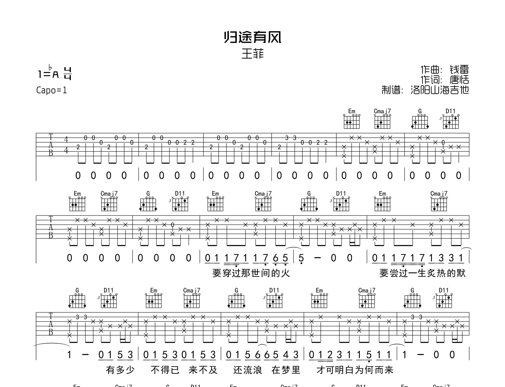 曲谱介绍: 《归途有风》吉他谱,王菲演唱,《归途有风》吉他弹唱谱,由@洛阳山海吉他编配制谱,本吉他谱采用G调和弦指法演奏,CAPO夹1品弹唱,节奏4/4拍,演奏难度简单。共3张高清图片谱例。