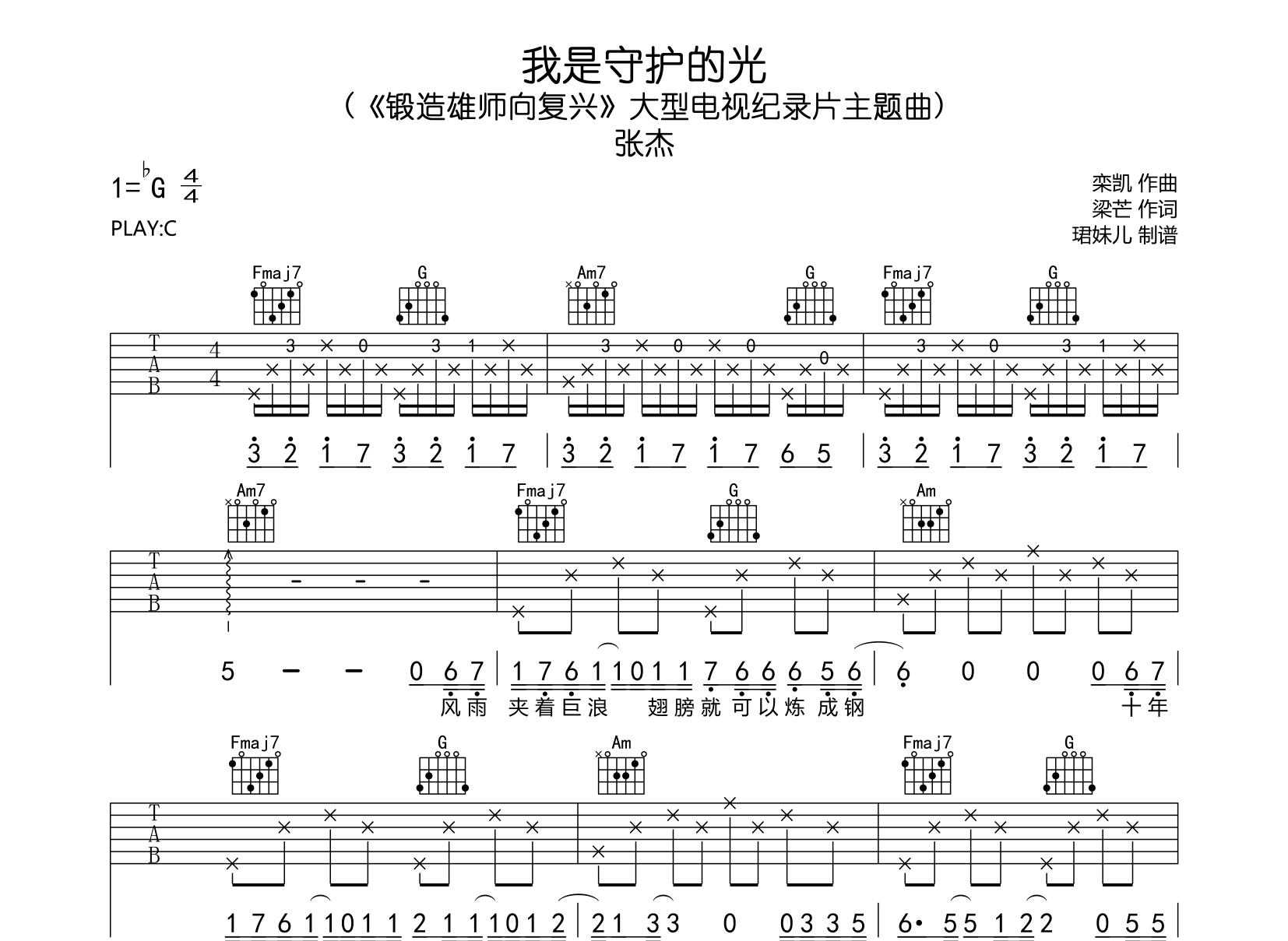 曲谱介绍: 张杰《我是守护的光》吉他谱, (《锻造雄师向复兴》大型电视纪录片主题曲) ,《我是守护的光》吉他弹唱谱,由@珺妹儿编配制谱,本吉他谱采用C调指法编配,弹原调可夹5-6品,速度85BPM,难度较简单,易上手。共3张高清图片谱例。