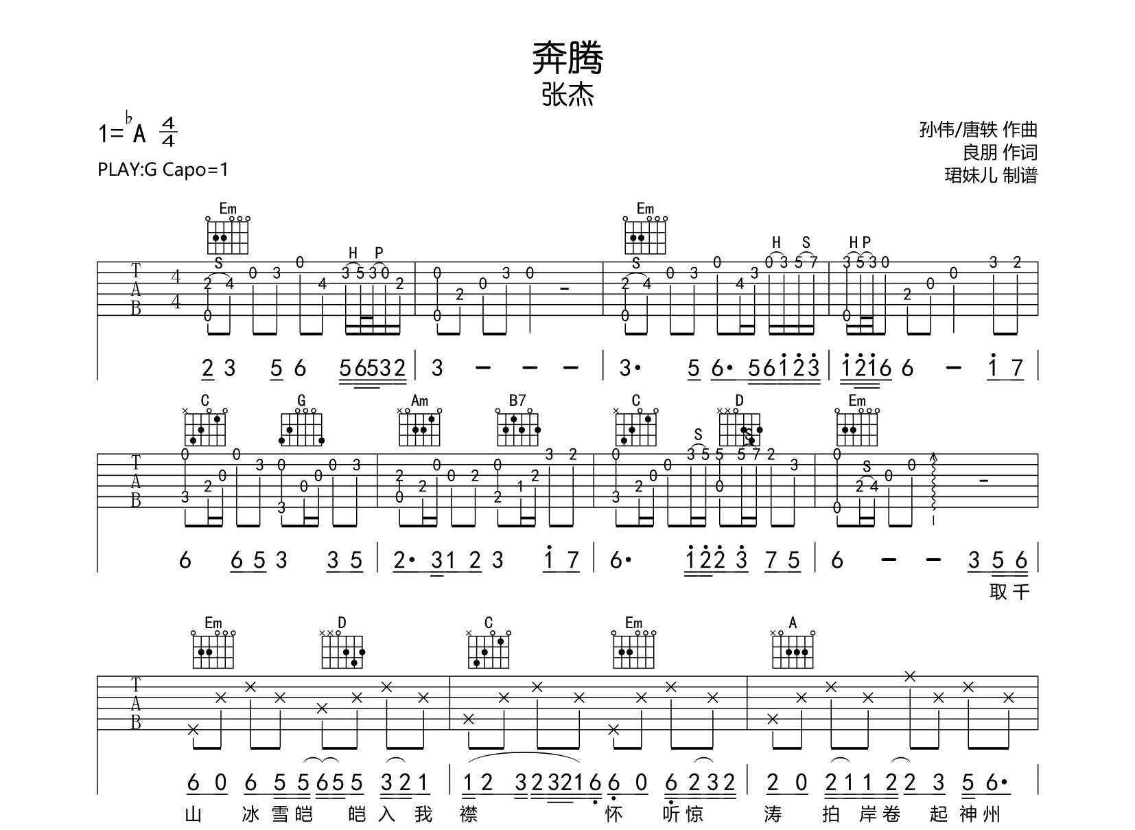 曲谱介绍: 奔腾吉他谱,张杰演唱,奔腾吉他弹唱谱,由珺妹儿编配制谱,本吉他谱采用G调指法编配,原调bA,弹唱建议变调夹1品,速度85BPM,难度较简单,易上手。共2张高清图片谱例。