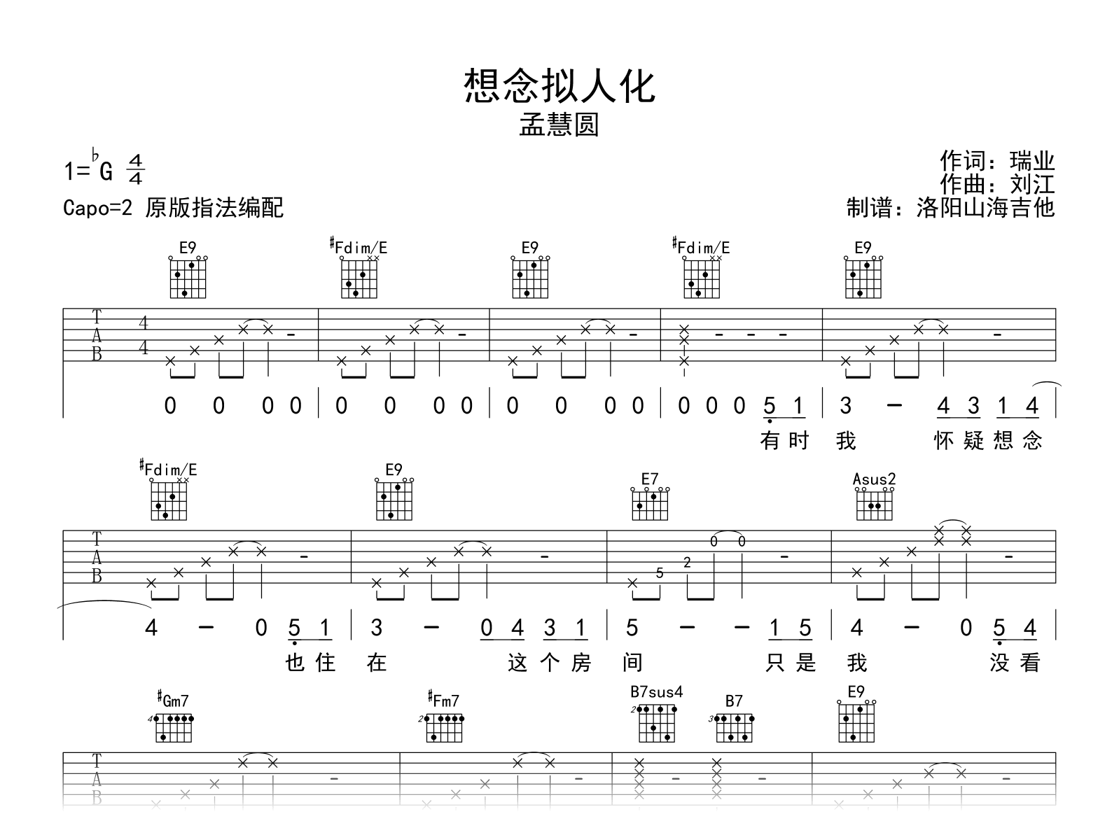 想念拟人化吉他谱 - 孟慧圆 - 吉他弹唱谱 - 原版