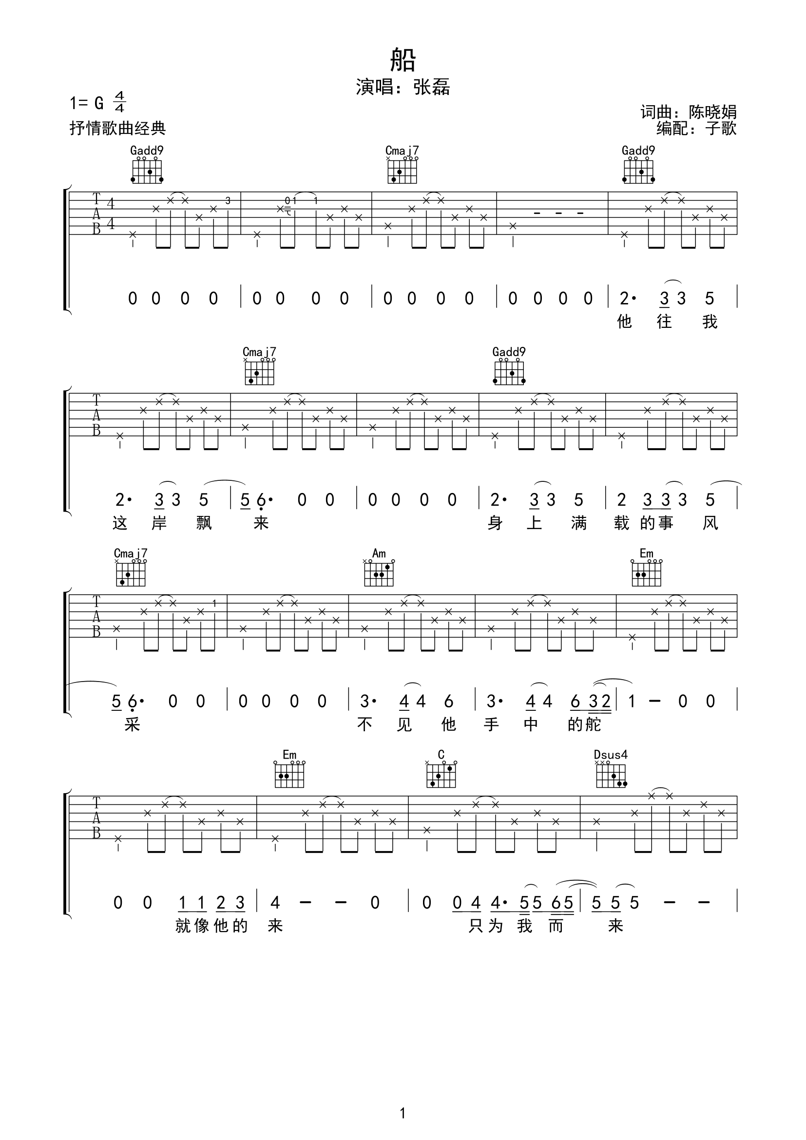 船吉他谱 - 张磊 - G调吉他弹唱谱